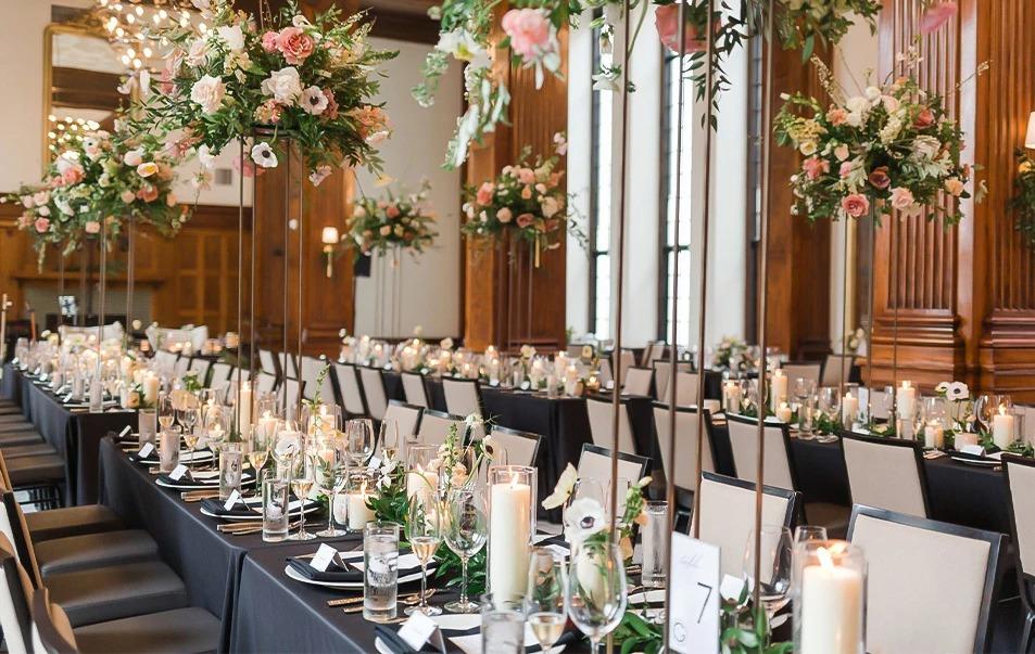 - Tables and Banquet Chairs - White, Black, or Ivory table linens and napkin - Basic Centerpieces - All dishware, glassware, and flatware