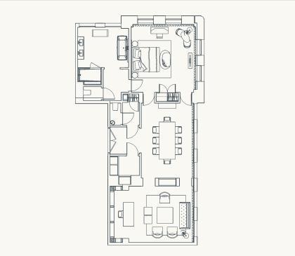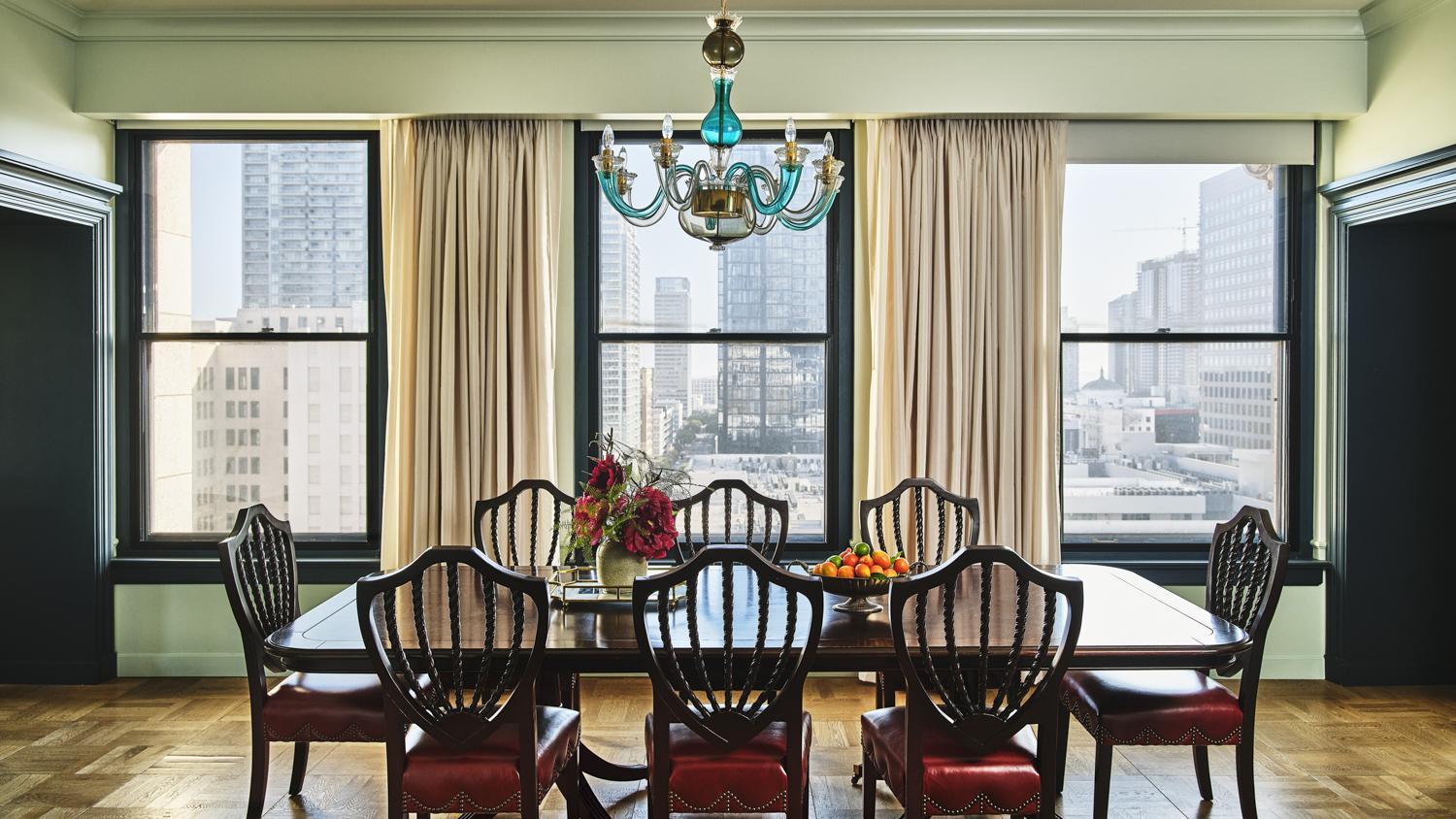 Located on the top floor of the hotel, the presidential suite boasts surrounding windows with bright skyline views of Downtown Los Angeles and offers abundant space in a residential inspired setting including a formal double door entry foyer, powder room and kitchenette. The dining room has a Murano glass chandelier set above a large dining table that can accommodate an intimate meal for up to 8 people.