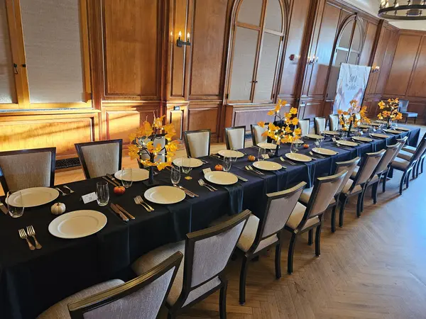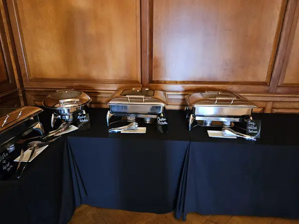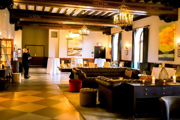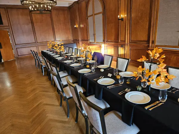 Hotel Saranac was such a lovely venue to host our welcome dinner for our wedding weekend. We booked the grand ballroom for the event. We were a little worried about the space being a little big for our group but the staff helped add in some additional furniture to soften the space. We were given the space from 2PM - 10PM which allowed us time to set up earlier before going to our rehearsal and coming back for the event. All the tables, plates/silverwear, furniture, etc were set-up already before we arrived at 2:30PM to add our little pieces of decor. We chose the Hot Sara Buffet Ampersand Option which comes with: a leefy green salad with cucumbers, feta, craisins and a honey vinagrette, a choice a two entrees (we chose chicken piccata in a lemon caper sauce and Seared Salmon with maple, soy and ginger glaze) and three sides (we chose sautéed haricots verts, red bliss garlic mashed potatoes and Long Grain and wild rice pilaf. The buffet dinner also was served with dinner rolls and whipped butter and an assorted cookies and dessert bar display. Everything was delicious. Both entrees flavors were perfect. Everyone raved about the salmon. Blake, the venue coordinator, was so great throughout the whole process with any questions we had. We ended up using 4 tables with about 6 people at each and connected them all to make one long table. We are so happy with how everything turned out. Thank you to all the staff at hotel Saranac that supported our event. :)