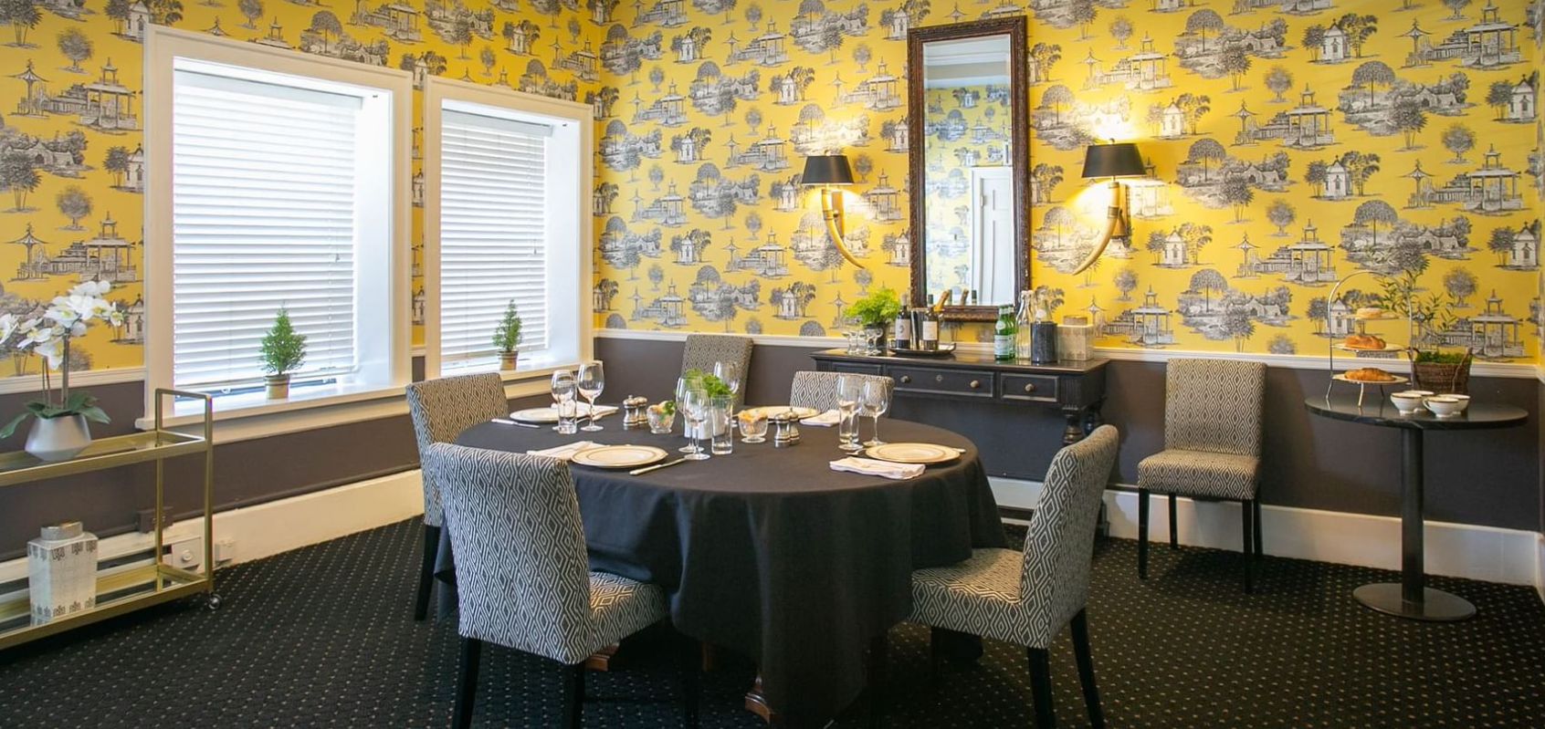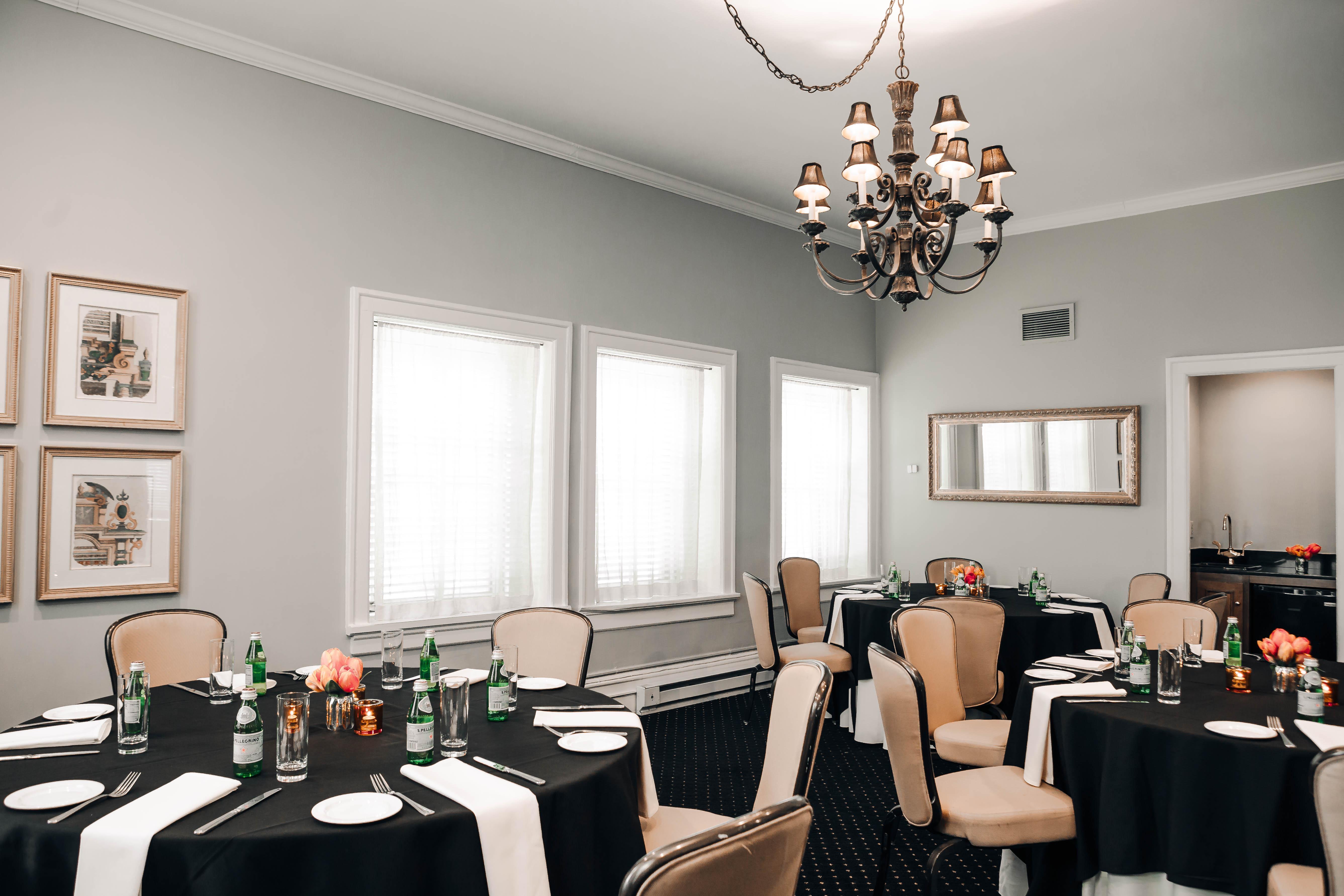An elegant room with bright windows overlooking bustling Madison Street. This space is perfect for rehearsal dinners and farewell brunche