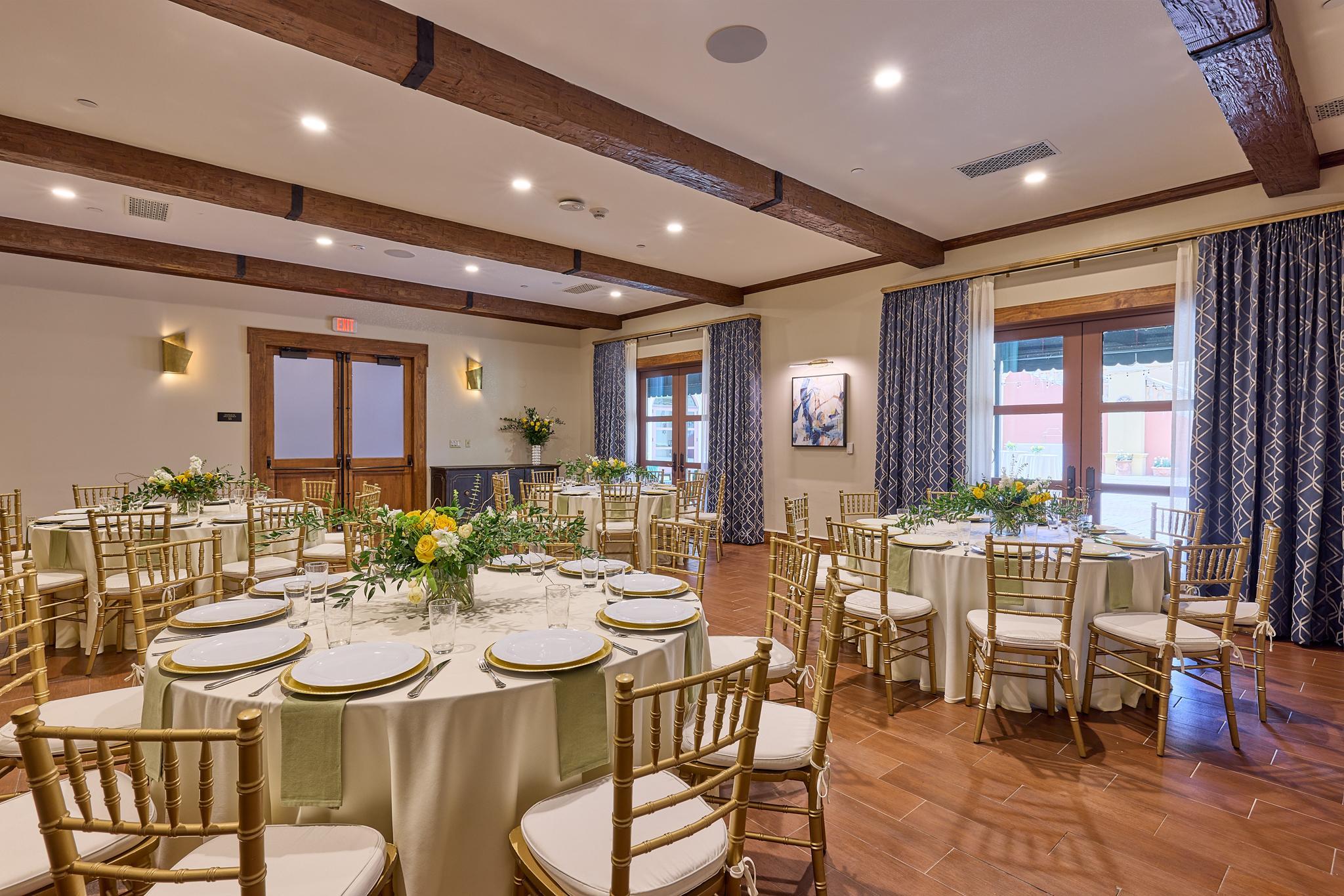 Our ballroom space, Cypress Ballroom, is the perfect venue for your dream wedding, complete with three designer wrought iron chandeliers and French doors that open onto the central courtyard.