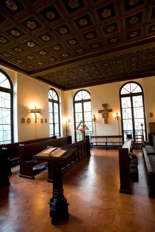 The Chapel originally served as Edith Fabbri’s formal drawing room. The carved mantel, which now serves as the reredos for the altar, and the coffered ceiling were both parts of Fabbri’s collection of architectural fragments. The leaded-glass windows, installed in 1985, were designed and executed by Bonnie Farber of Glastonbury, Connecticut. The triptych over the altar was painted by the Rev. John Walsted and donated to the House in 2001.