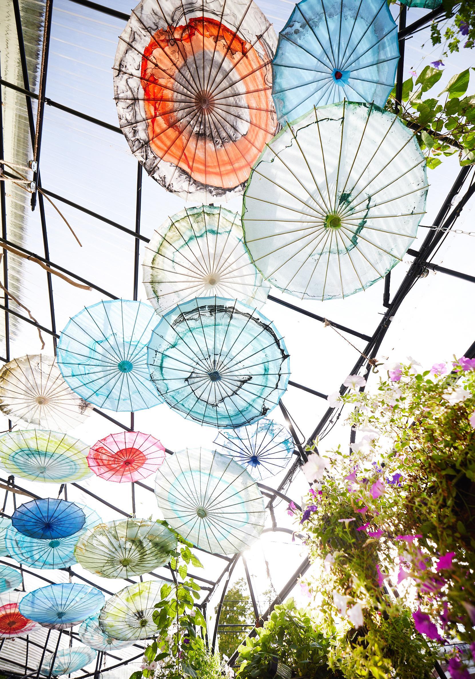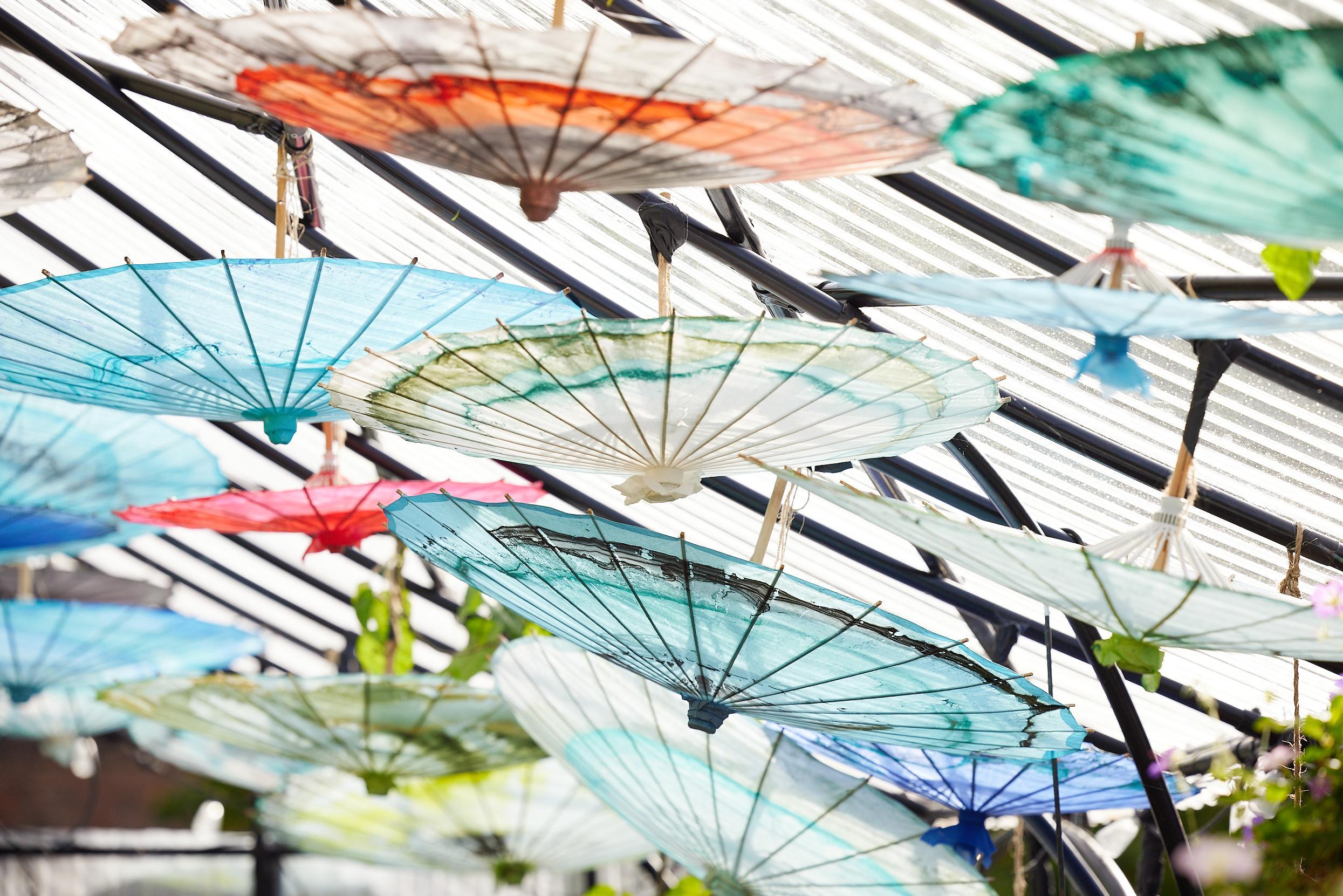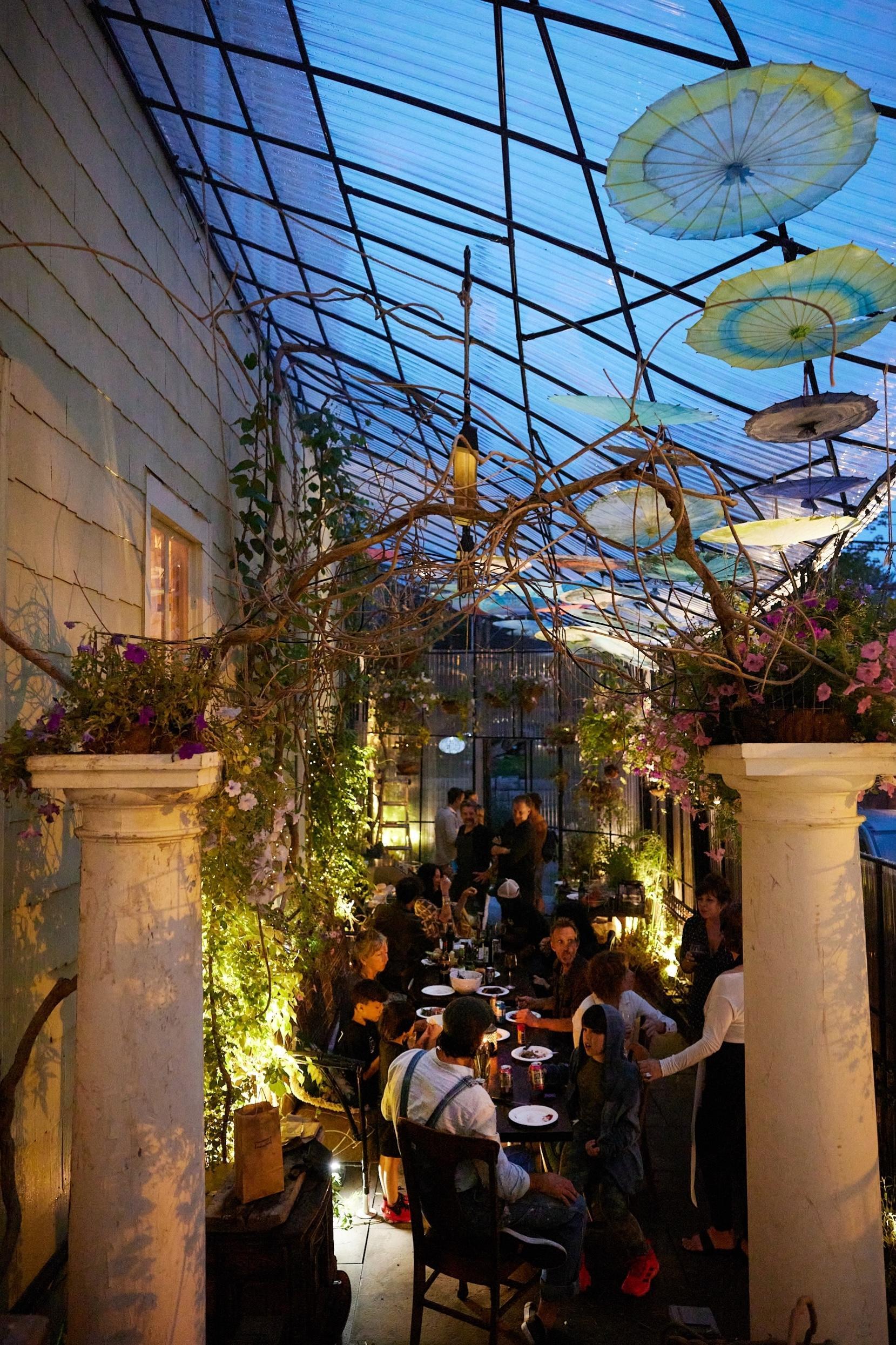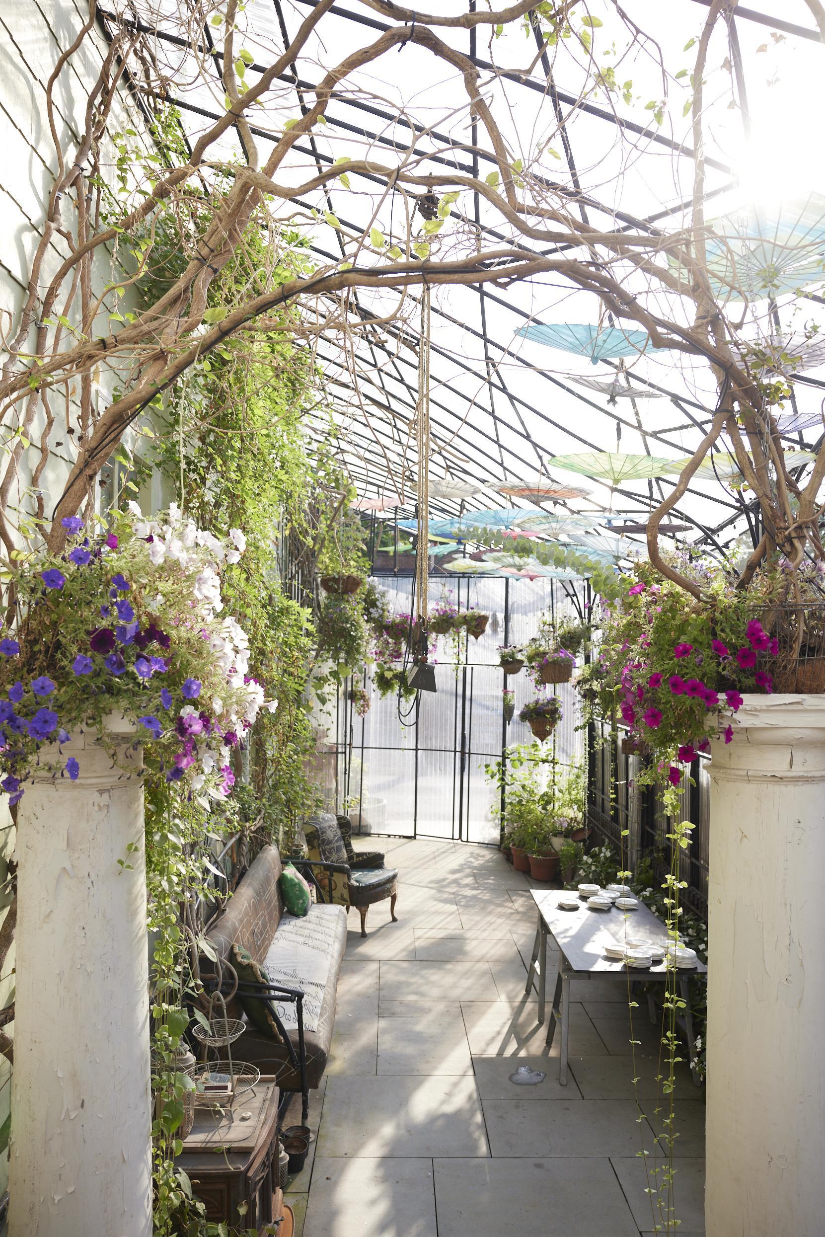 Covered outdoor space under art nouveau style "dragonfly" shaped awning.