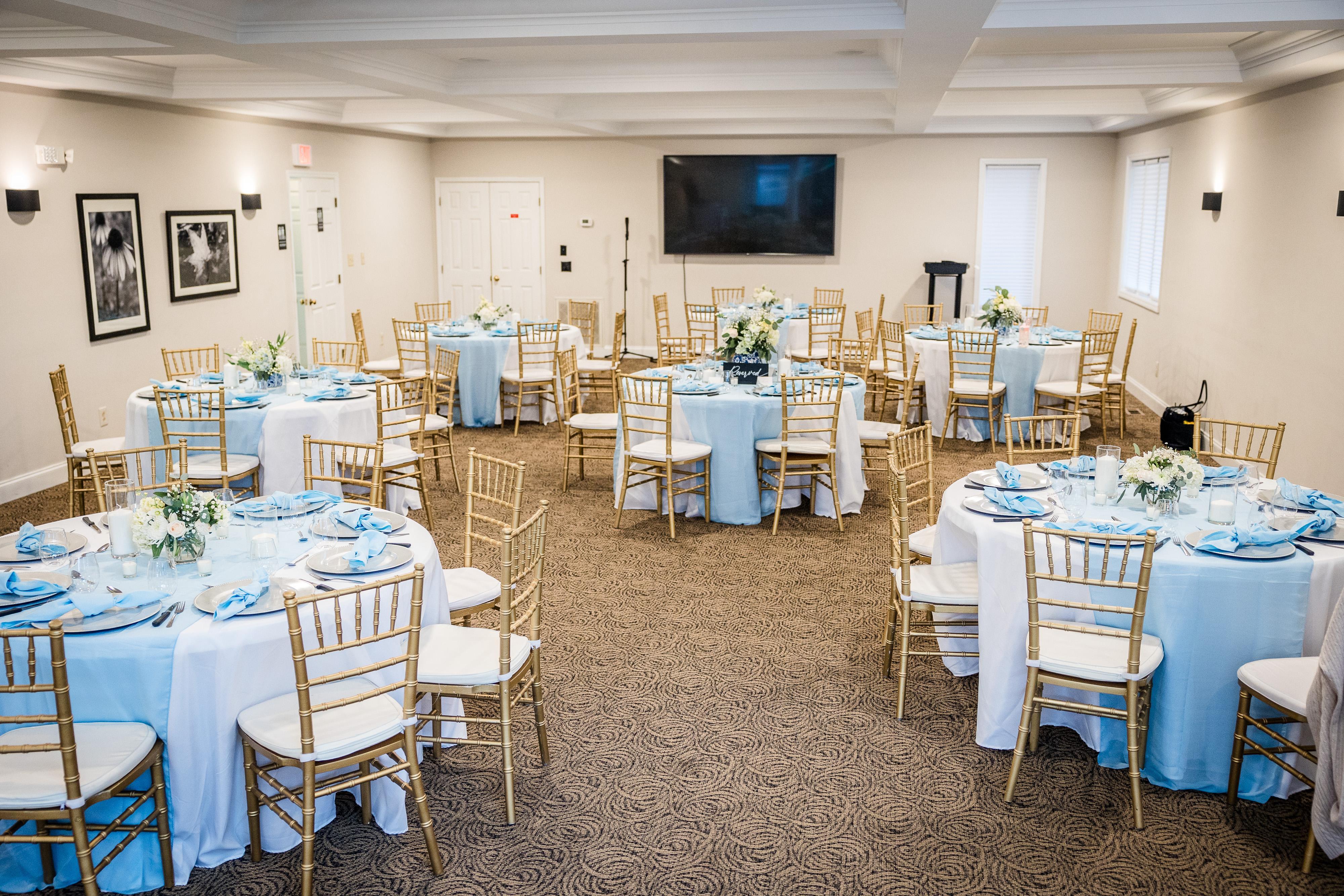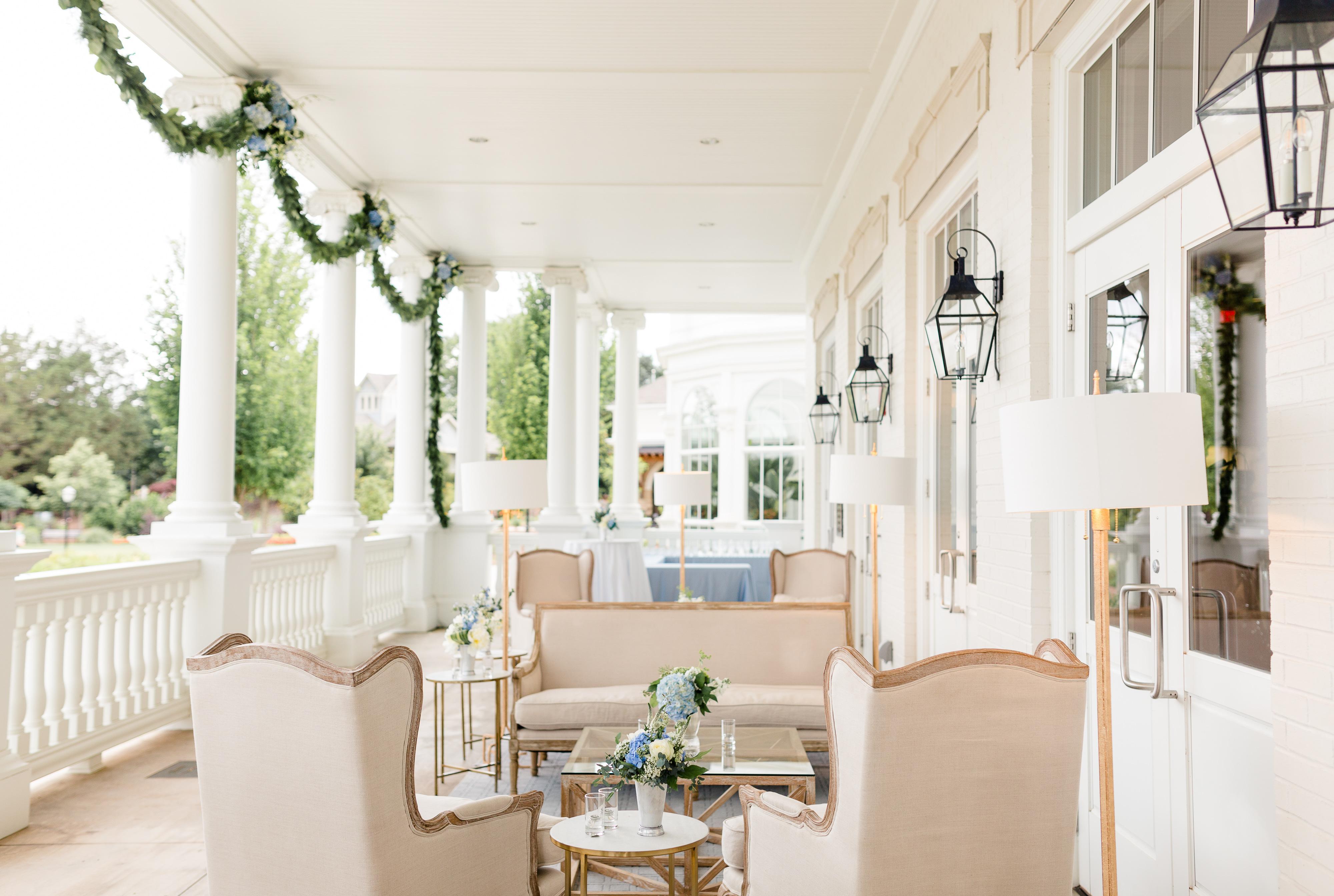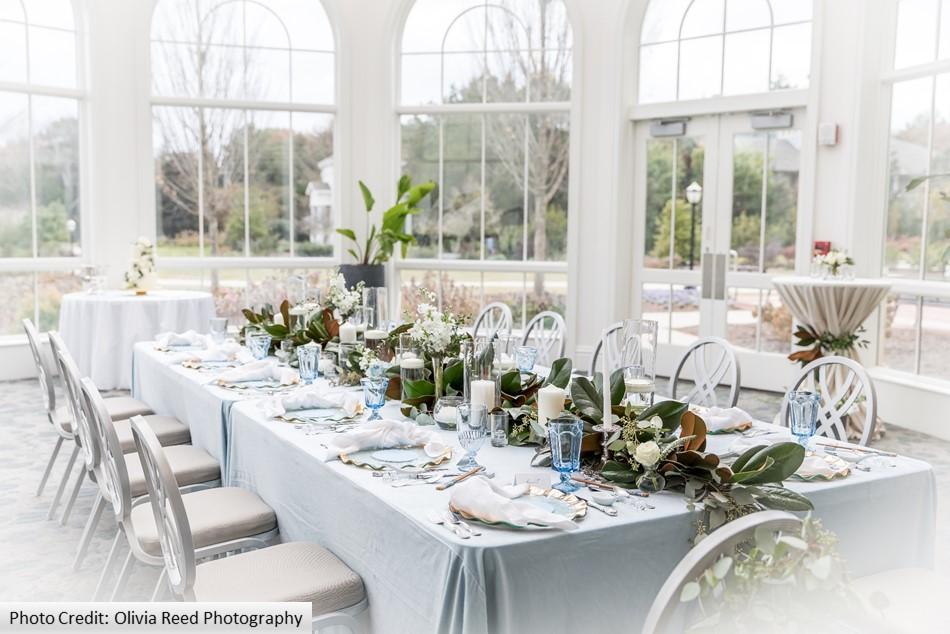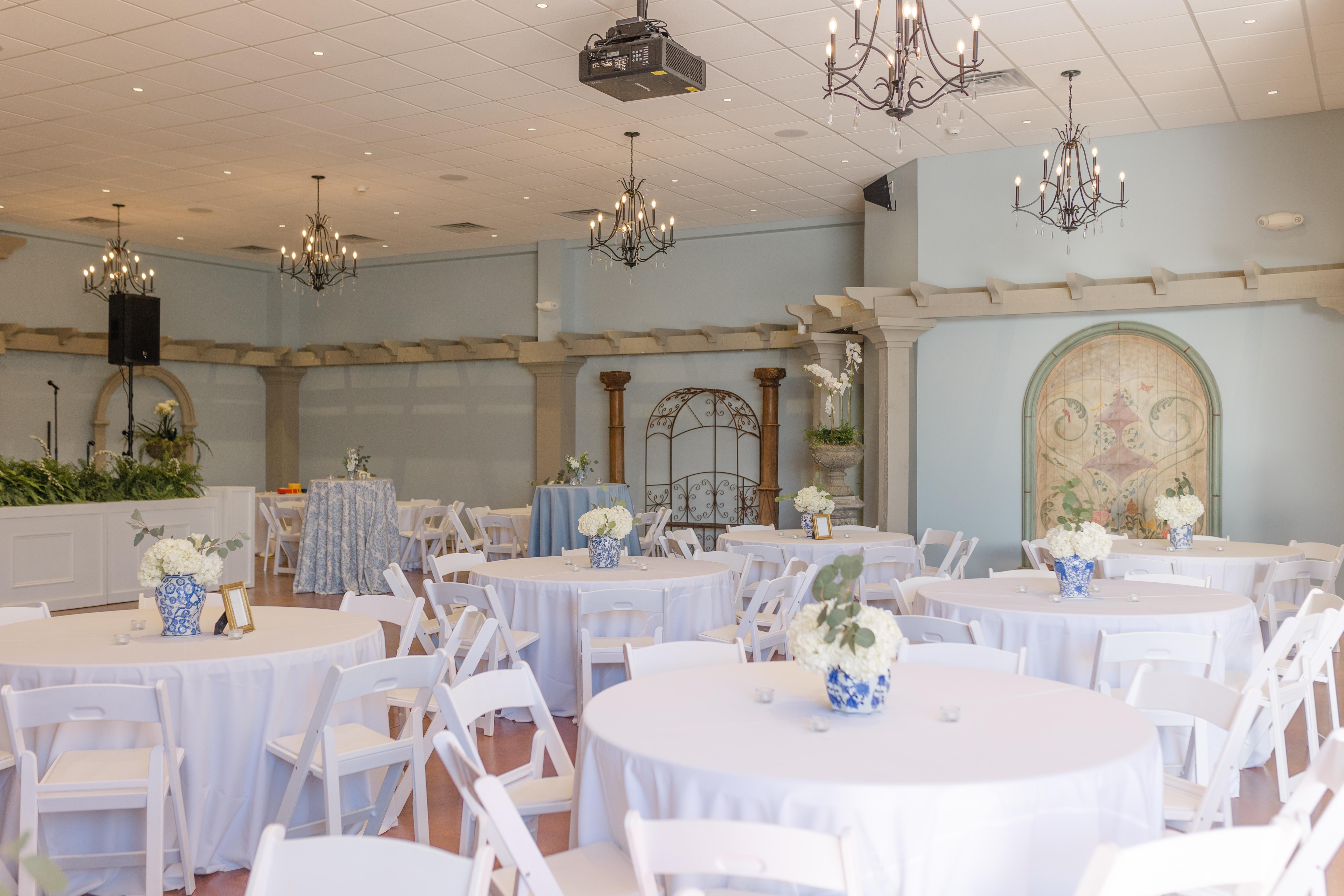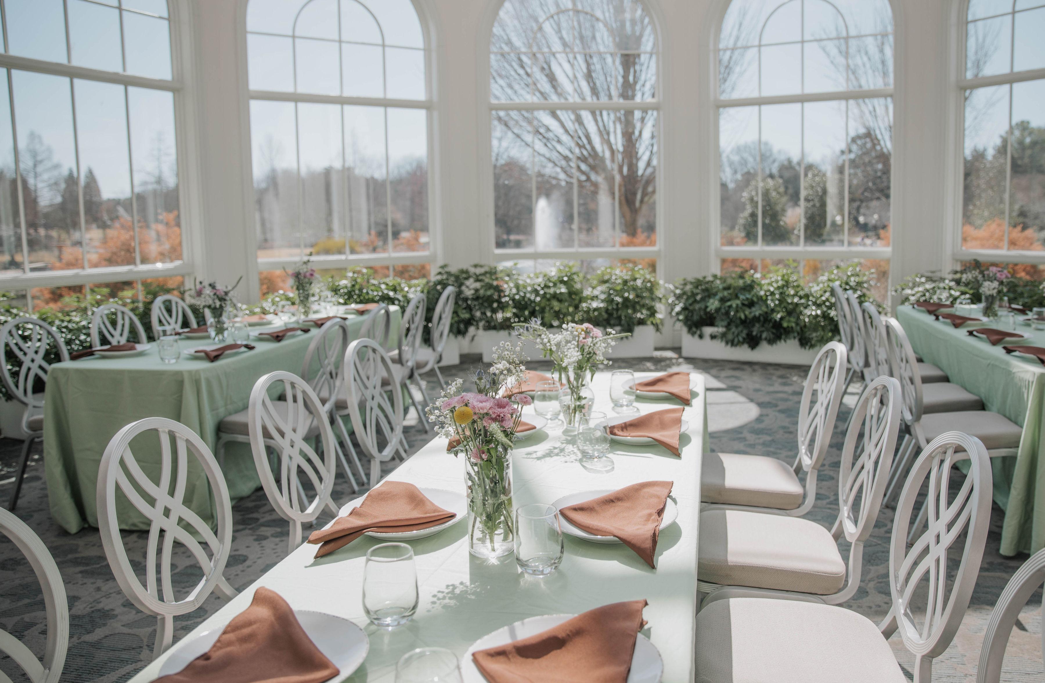 The Conservatory is a beautiful, windowed room with a gorgeous view of the Garden! The space can seat a maximum of 50 guests and 80 standing.