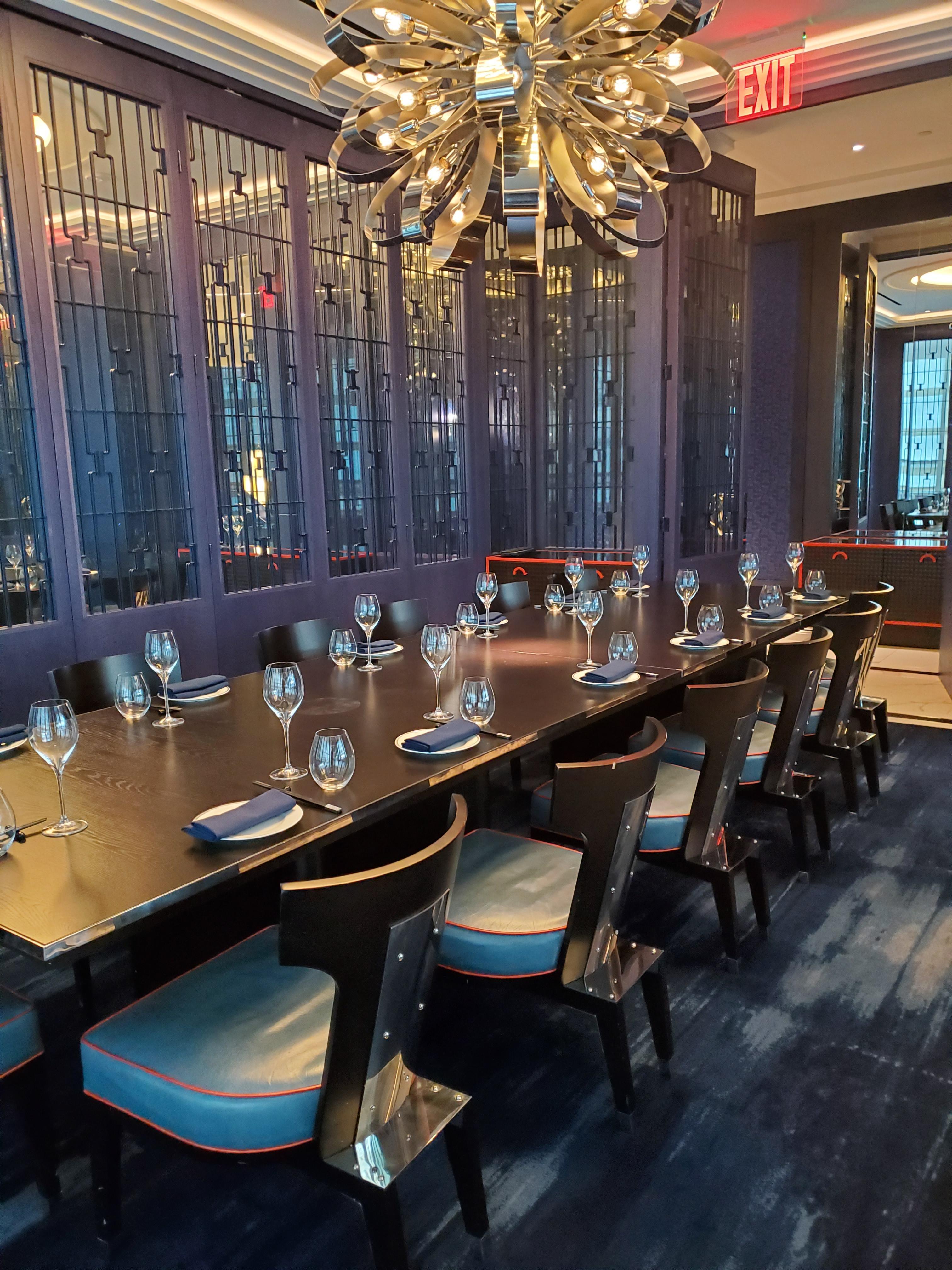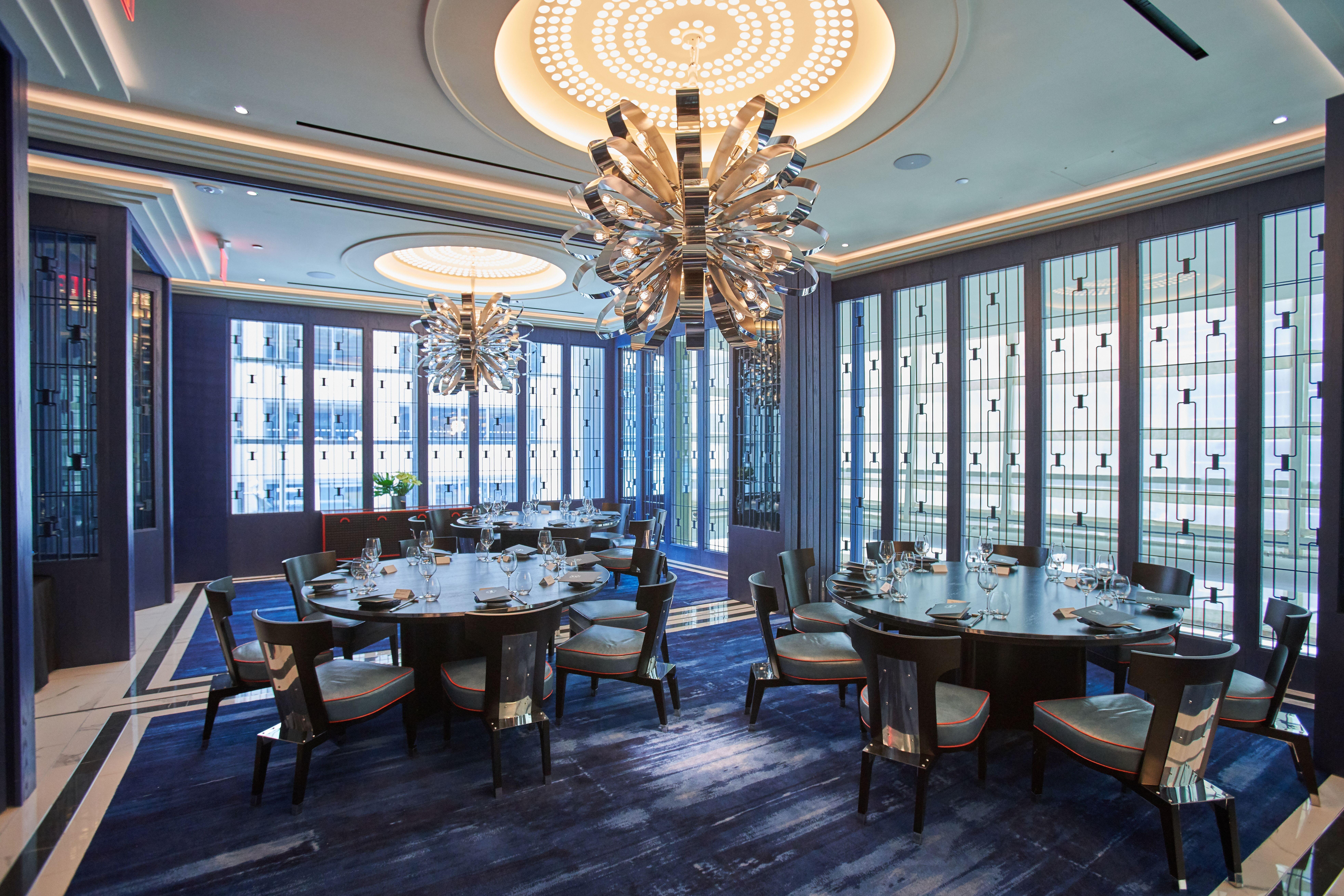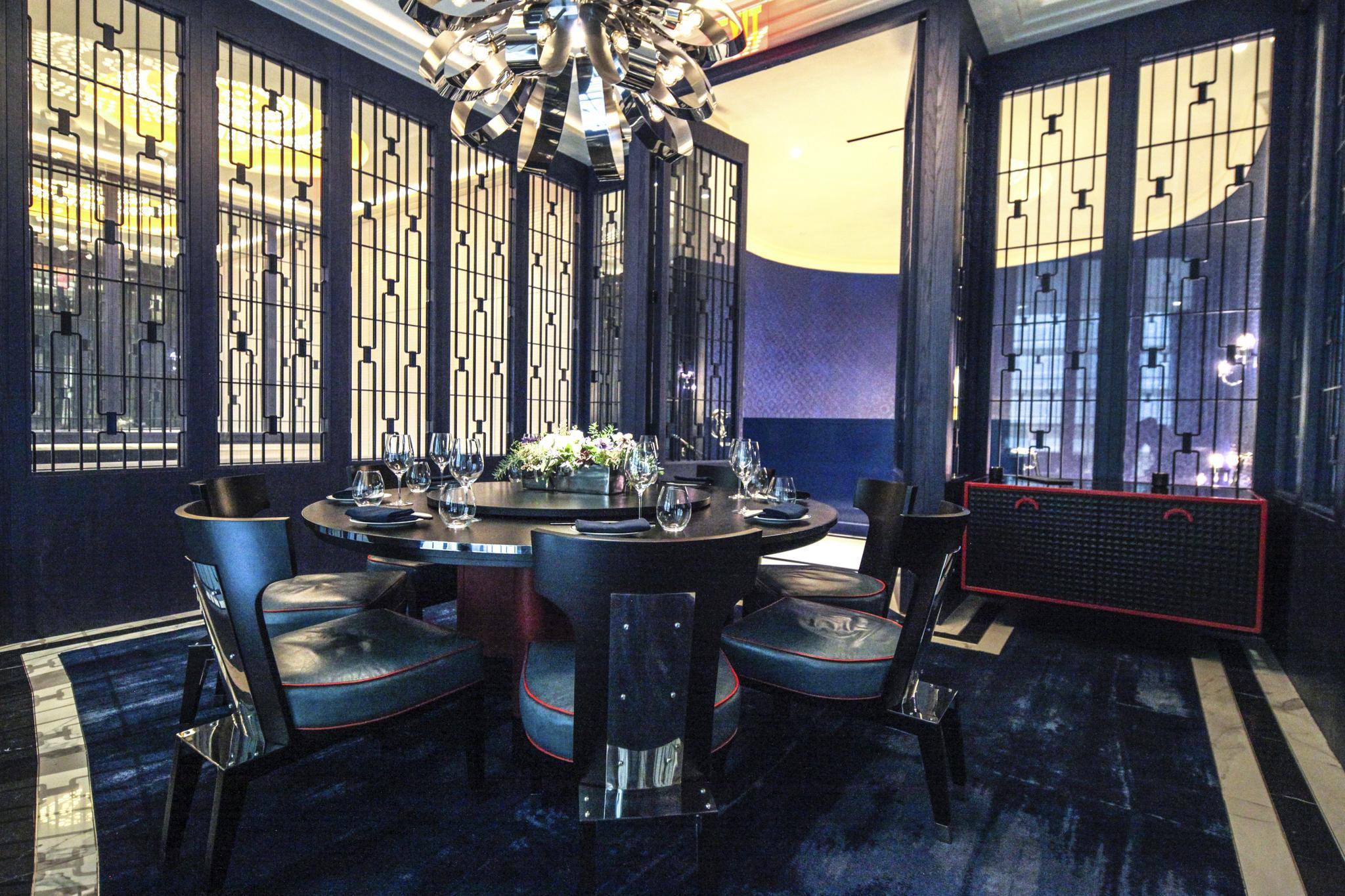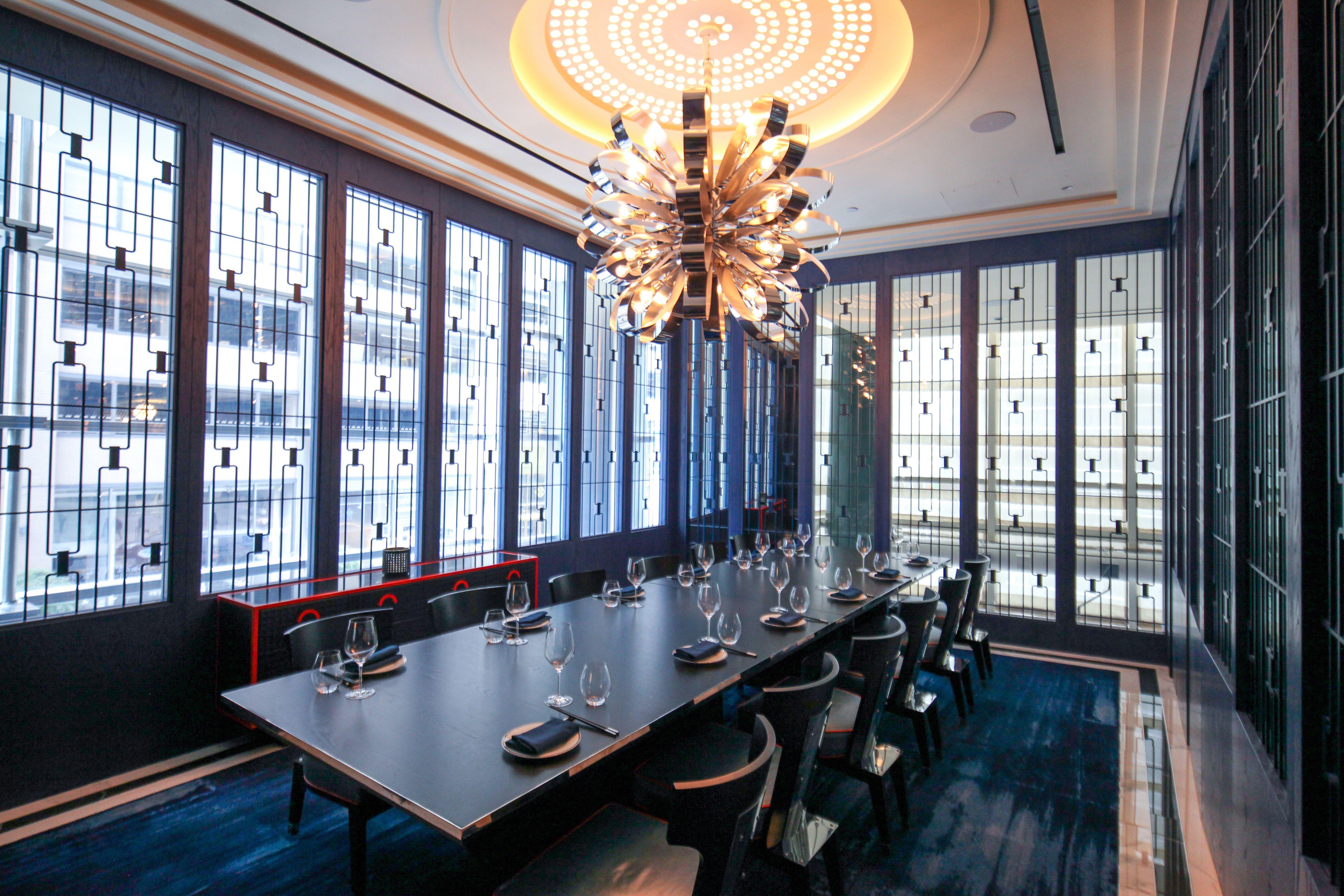 This room has windows over 58th street. This private dining room is adorned with ink-blue latticework and accented by dragon's blood orange.
