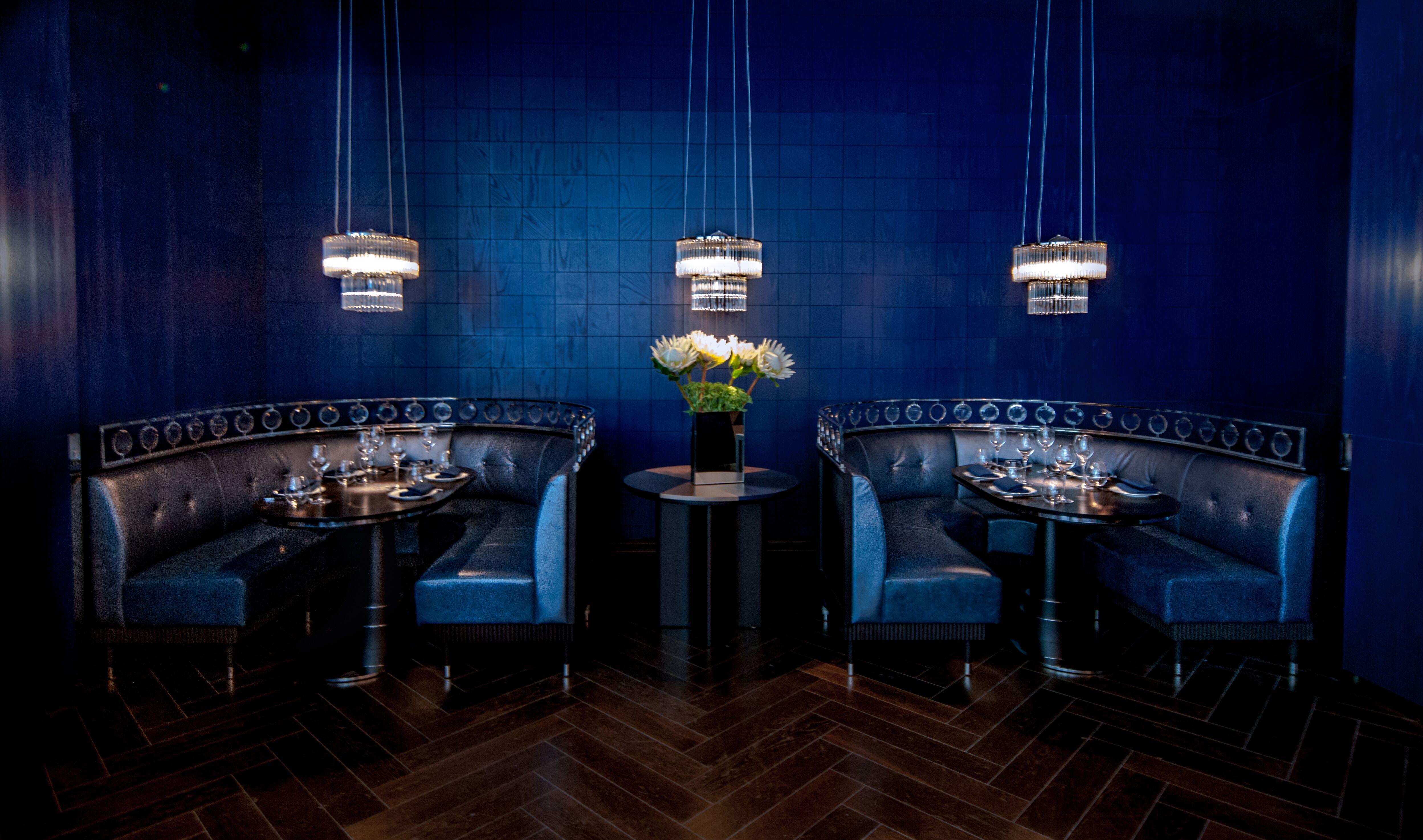 Our most intimate room is adorned with ink-blue latticework and accented by dragon's blood orange.