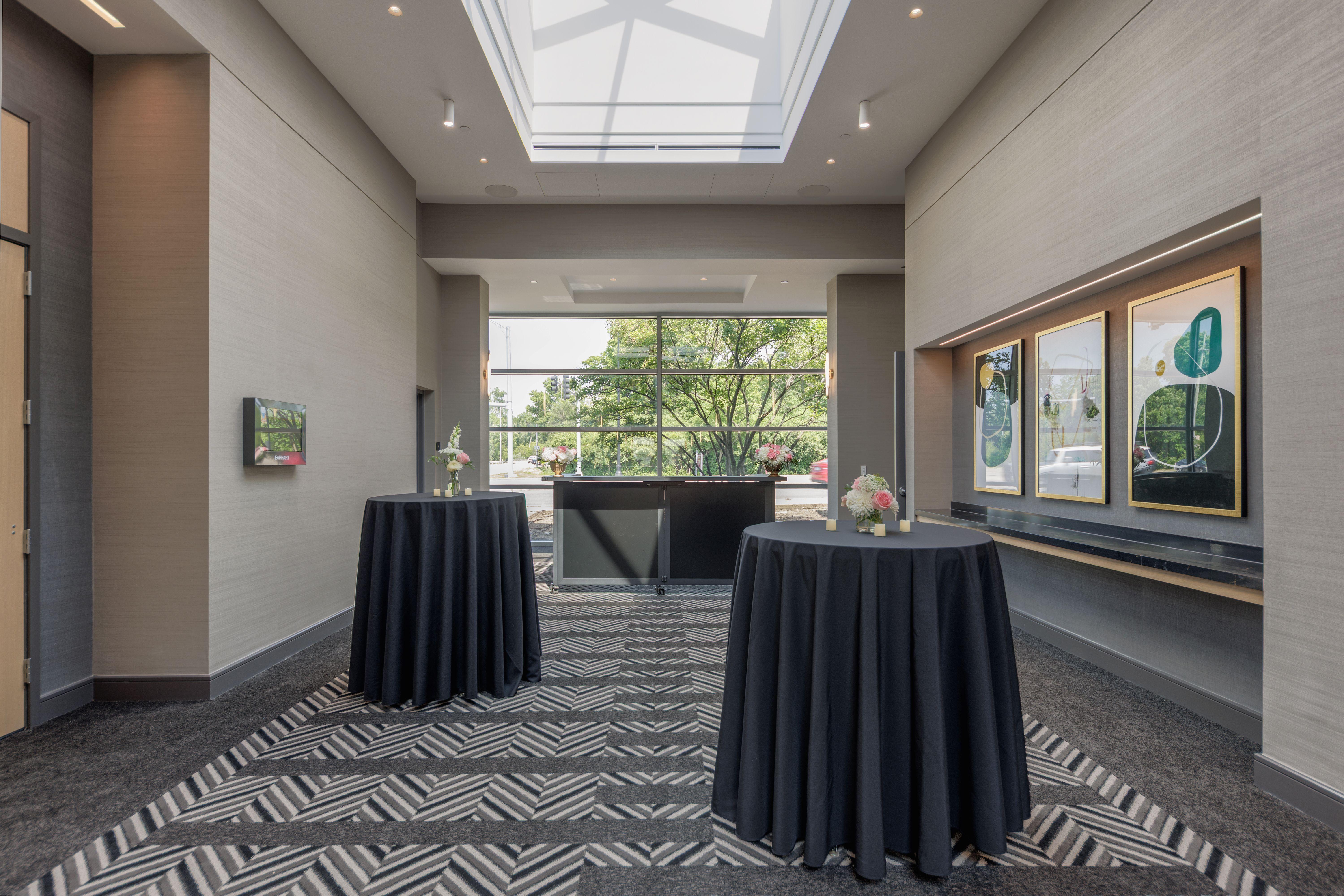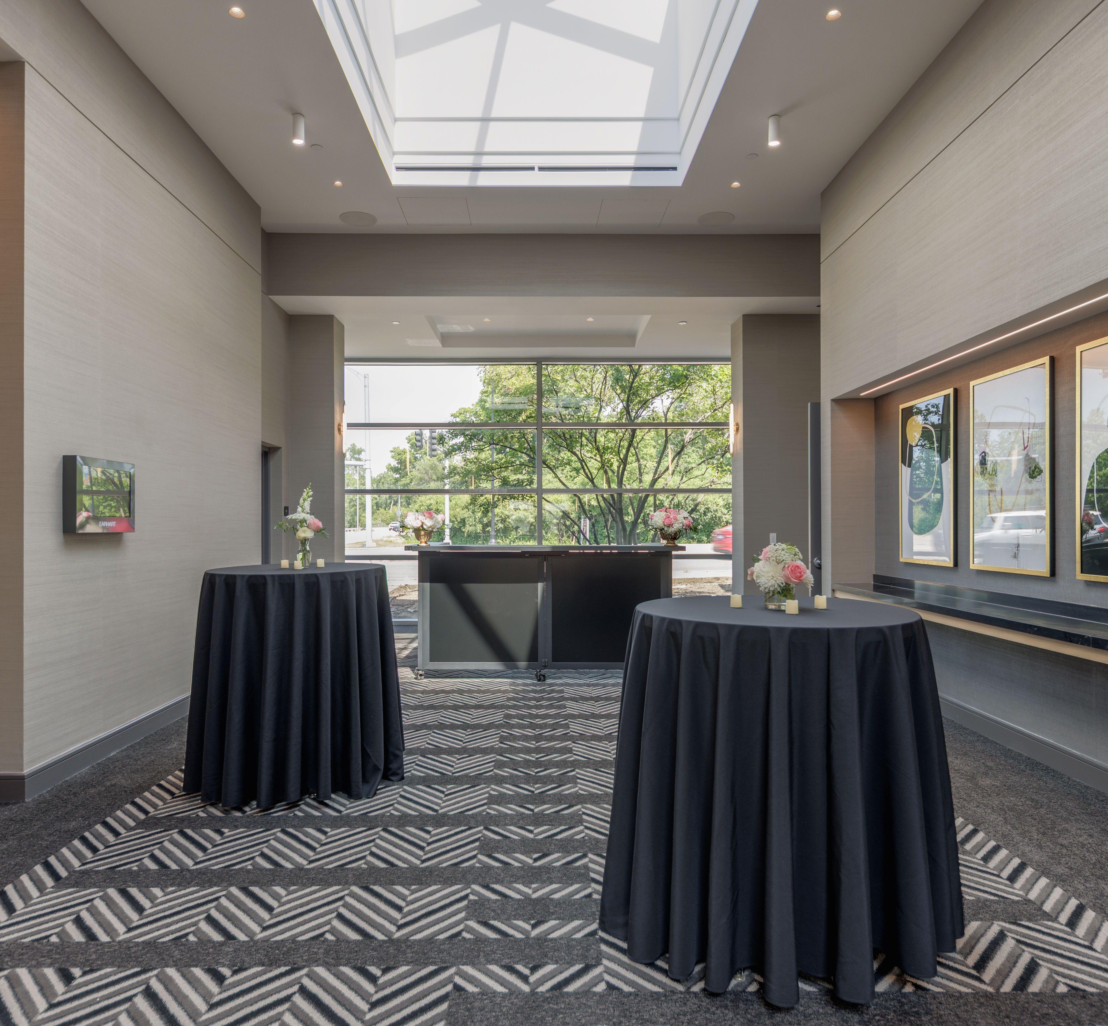 Space offers 4000SF, with windows and multiple doors that lead to our pre-function area. Event space is located near the Front Desk and easy access from our covered garage. Hotel offers a bar and restaurant that can be used as a gathering area until the event starts.