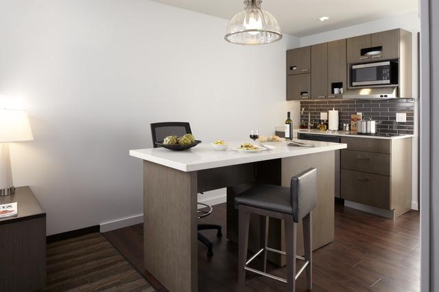 Our spacious studio gives you ample space to keep routines rolling. The spacious suite features a divided living and sleeping area with a sofa-sectional with sofa bed, one king plush Hyatt Grand Bed®, and fully-equipped stainless kitchen. Other features include a spacious closet, 42" flat panel TV, dedicated workspace and a generous bathroom with a glass walk-in shower. With your stay, enjoy complimentary Wi-Fi and our Morning Spread breakfast with Omelet Bar.