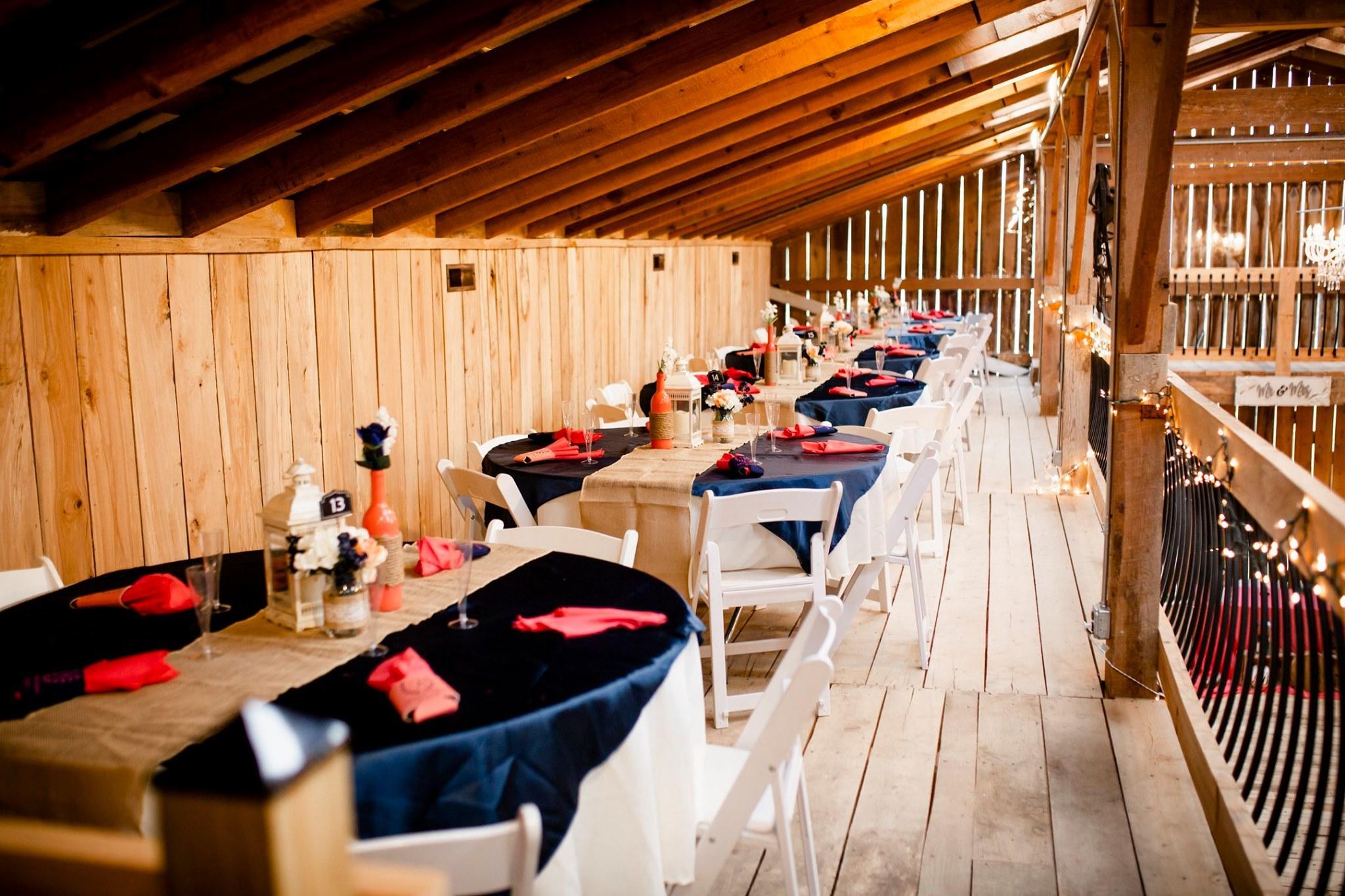 Beautiful 5000 sq. ft. wedding barn with indoor heating and air conditioning. Our property includes an outdoor pavilion space connected to the barn for those couples who wish to have their ceremony outside and reception indoors. Rainy wedding day? That’s no issue! We have enough seating for 200 guests and include table linens and use of our in house decorations for free with your venue rental.