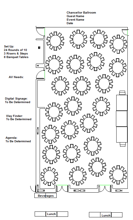 The Chancellor Ballroom is approximately 4000 square feet and can comfortably seat up to 200 guests at banquet rounds, 180 at classroom tables, or 350 seated theatre style.