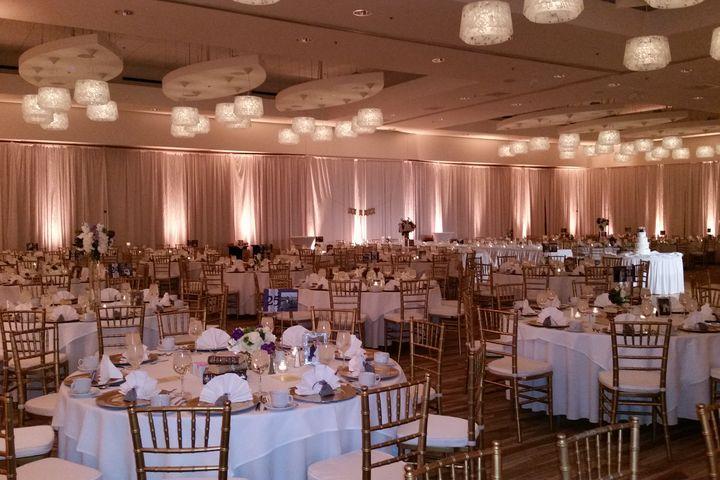 Our newest 11,500 square foot ballroom, Heritage Hall, can section it off for smaller headcounts AND for various purposes for your wedding. Perhaps the most exciting option when renting Heritage Hall is to use the atrium lobby outside of Heritage Hall for your ceremony. The expansive wall of windows brings the natural light into the space, highlighting over 100 feet of the aisle for your "walk down the aisle". We also have color choices for the ceiling lighting in this area as well.