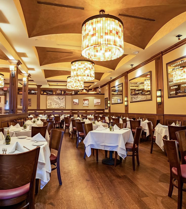 Furnished in gorgeous dark wood adjacent to a large bar, the dining room is a truly palatial experience for anyone seeking an authentic Italian dining experience. The dining room welcomes everyone with a warm “Buona Sera!”