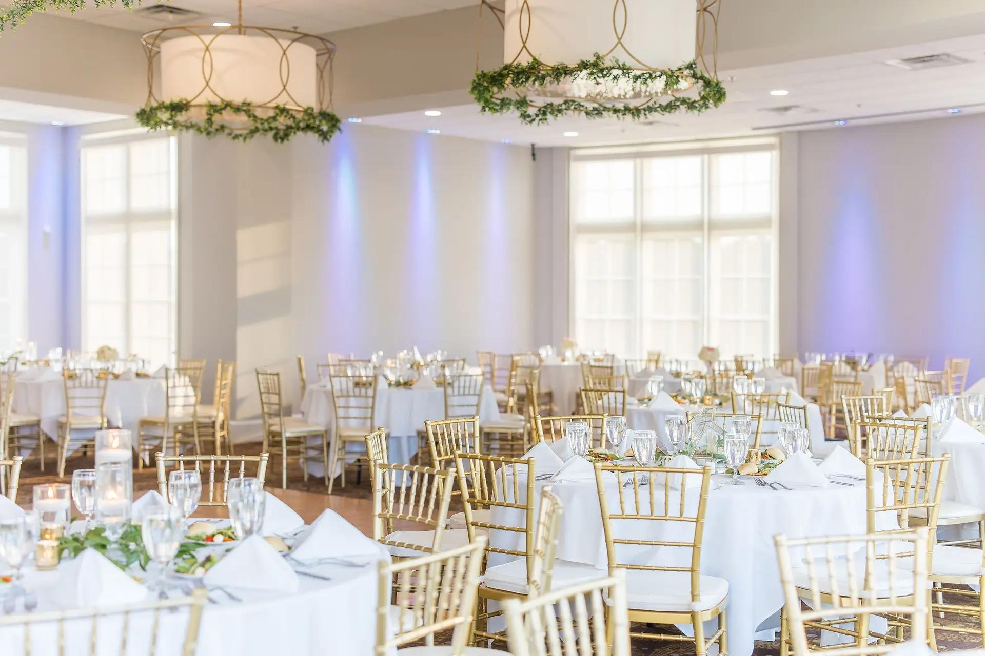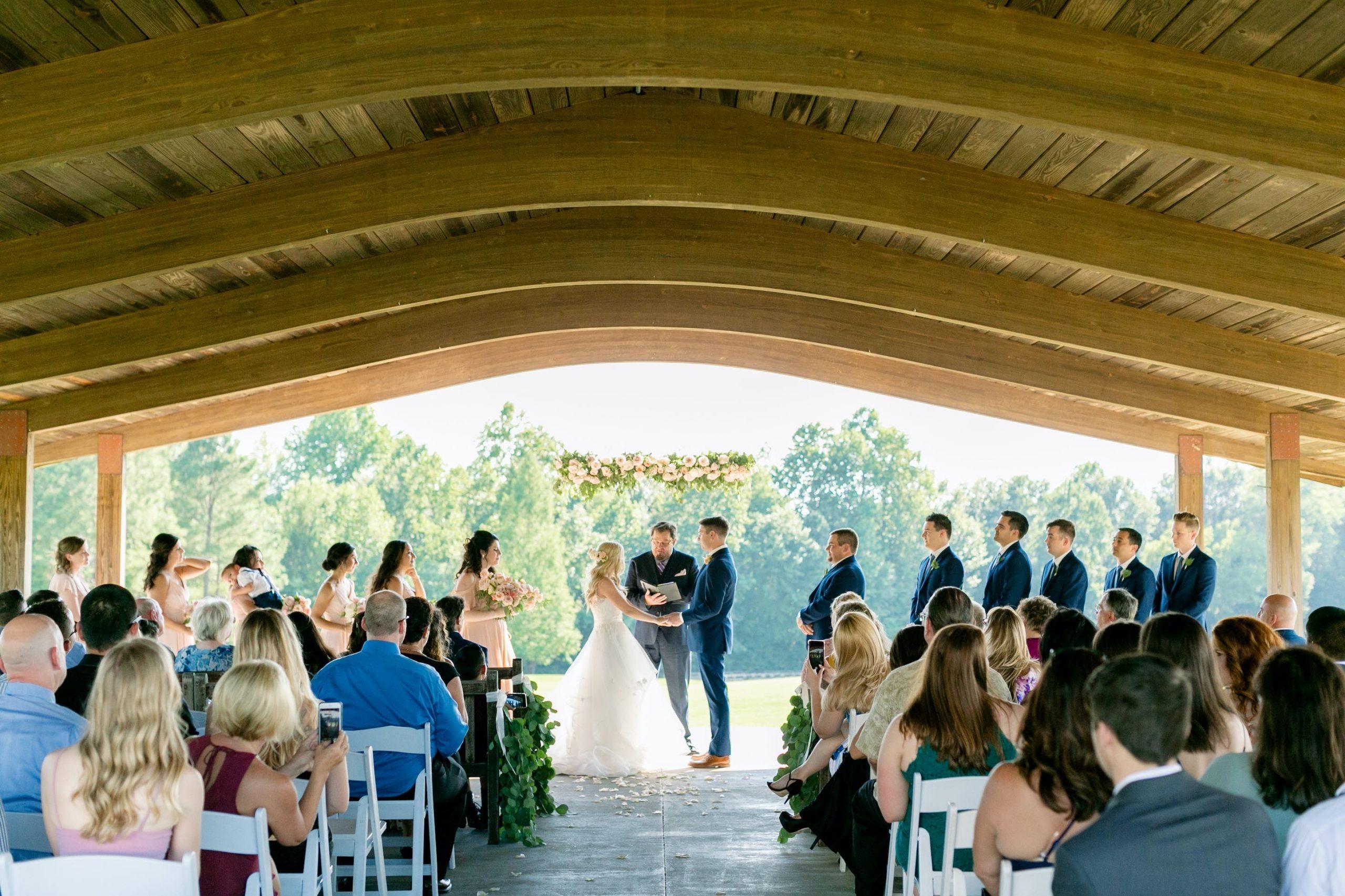 Every outdoor location comes with an equally stunning indoor rain plan, ensuring your day is perfect no matter the weather. We provide white garden chairs and custom arbors in natural wood and white finishes for all ceremony sites, and our coordinating team will assist with planning and rehearsal. Our Ballroom is a spacious and neutral-toned space for ceremonies with large guest counts. Its floor-to-ceiling windows offer panoramic views of the property, and the room is fully customizable. The Fall Line is a versatile indoor space with abundant natural light, expansive views, and a spectacular chandelier. The Pavilion is known for its incredible natural lighting, where the sun creates an ethereal glow as you exchange vows under a rich, vaulted wooden ceiling. Lastly, The Lawn offers a stunning outdoor setting with the option to arrange your ceremony with a backdrop of green grass, blue skies, or the impressive Estate building.
