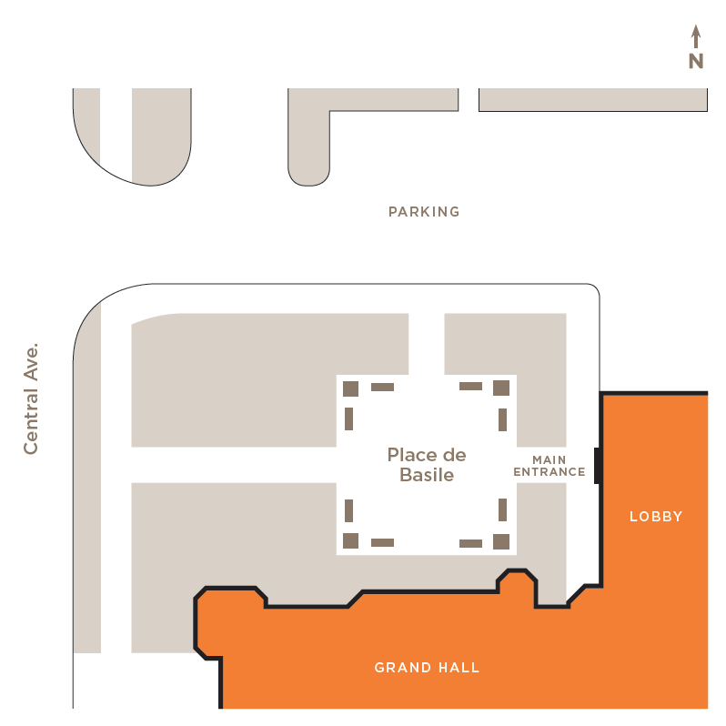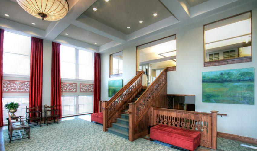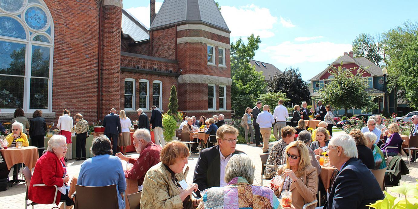 Surrounded by gardens and large planted urns, Place de Basile—a brick-paved entrance court—welcomes you to Indiana Landmarks Center, with an enormous stained glass window as a backdrop. In warmer months, it is an ideal area for outdoor pre- or post-event receptions.