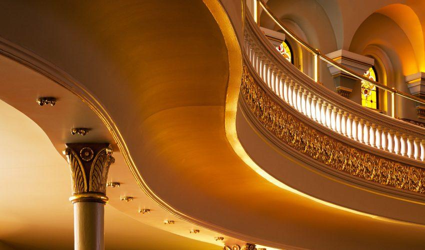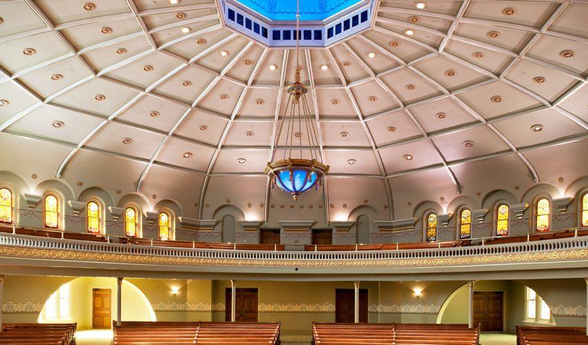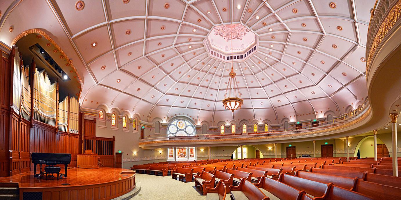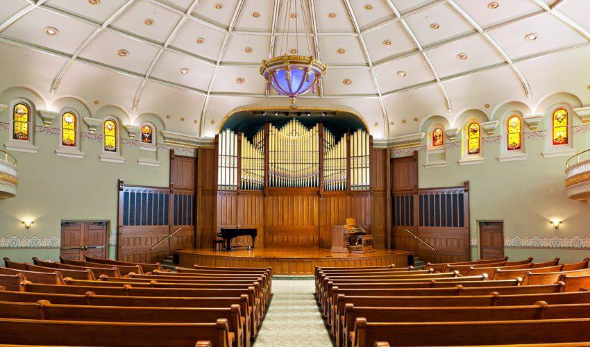 What began as a theater-style church sanctuary in 1891 functions as an ideal venue for weddings and other ceremonies, concerts, choirs and soloists, film screenings, auctions, speeches and panel discussions. “Wow” is the most common reaction among people entering the Grand Hall for the first time.The stenciled and gilded features—walls, dome and organ pipes—add to the historic atmosphere. With stage lights and computer-controlled colored lighting effects, we can bathe the domed ceiling, chandelier, and central dome in colored light of your choosing, or orchestrate a changing show.
