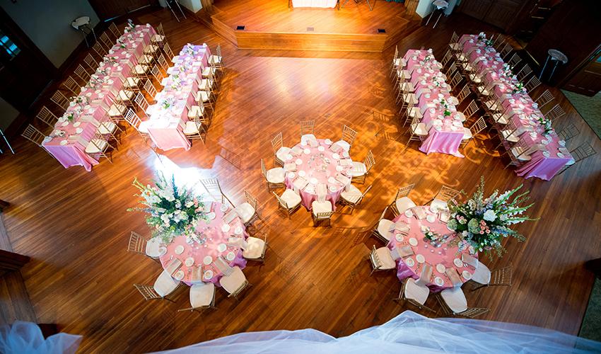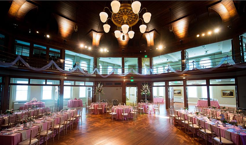 For weddings, the Grand Hall offers the look and feel of a church without the restrictions, and the reception can be held steps away in the adjacent Cook Theater. The balcony creates an excellent vantage point for dramatic wedding photos.