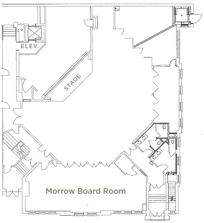 Constructed in 1900 and connected to the original building, Cook Theater is both large and intimate, a feat fostered by the rich, intricately patterned wood walls and ceiling, outstanding acoustics, and original chandelier. The main soaring theater space is surrounded by rooms that open to the theater on the main level and mezzanine.The proscenium stage, equipped with theatrical lighting, sound system, video projection, and a Yamaha C3 piano, has been used for concerts and small theatrical productions.