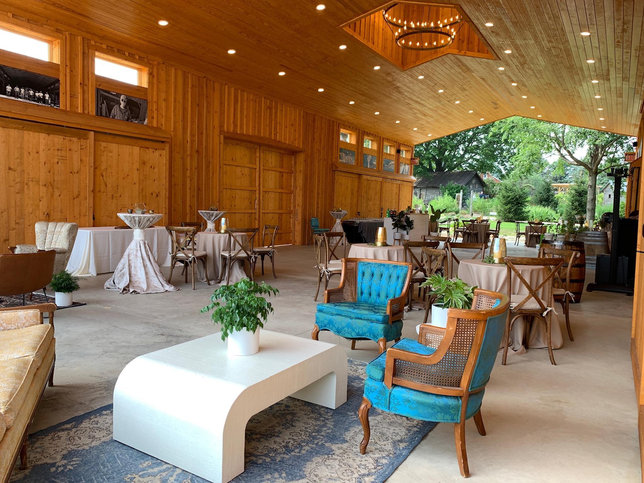 Dimmers for all lighting Sonos music system with speakers throughout Conversational furniture 6 Wine Barrels Writing Desk for Guest sign in Sweetheart Table with chairs miscellaneous other tables 18' Antique Capone's Bar - fully equipped Catering Kitchen Bridal Suite with covered porch and mini fridge Groom's Tavern with covered porch and mini fridge Wi-fi - designated fiber-optic high speed - live streaming