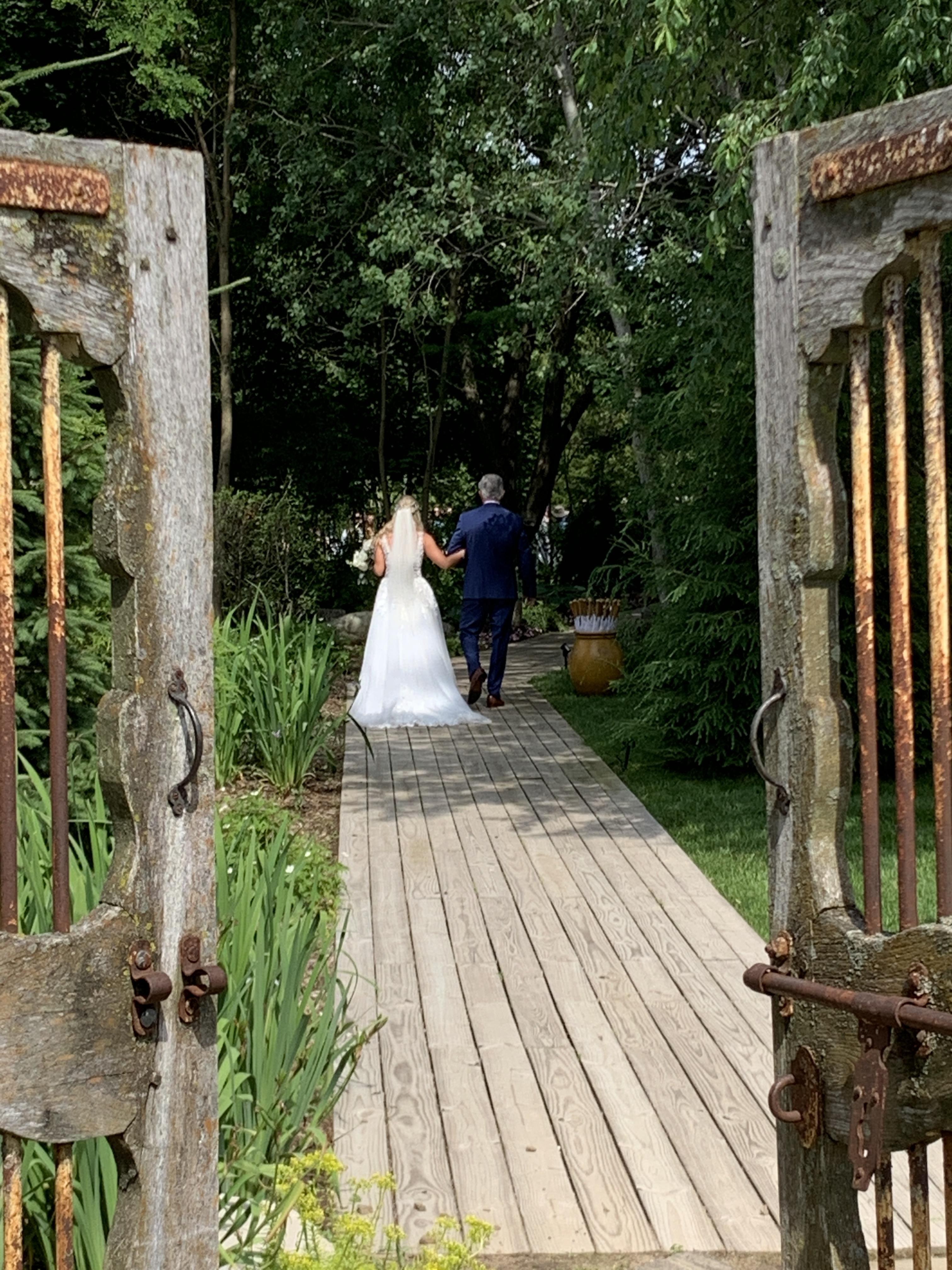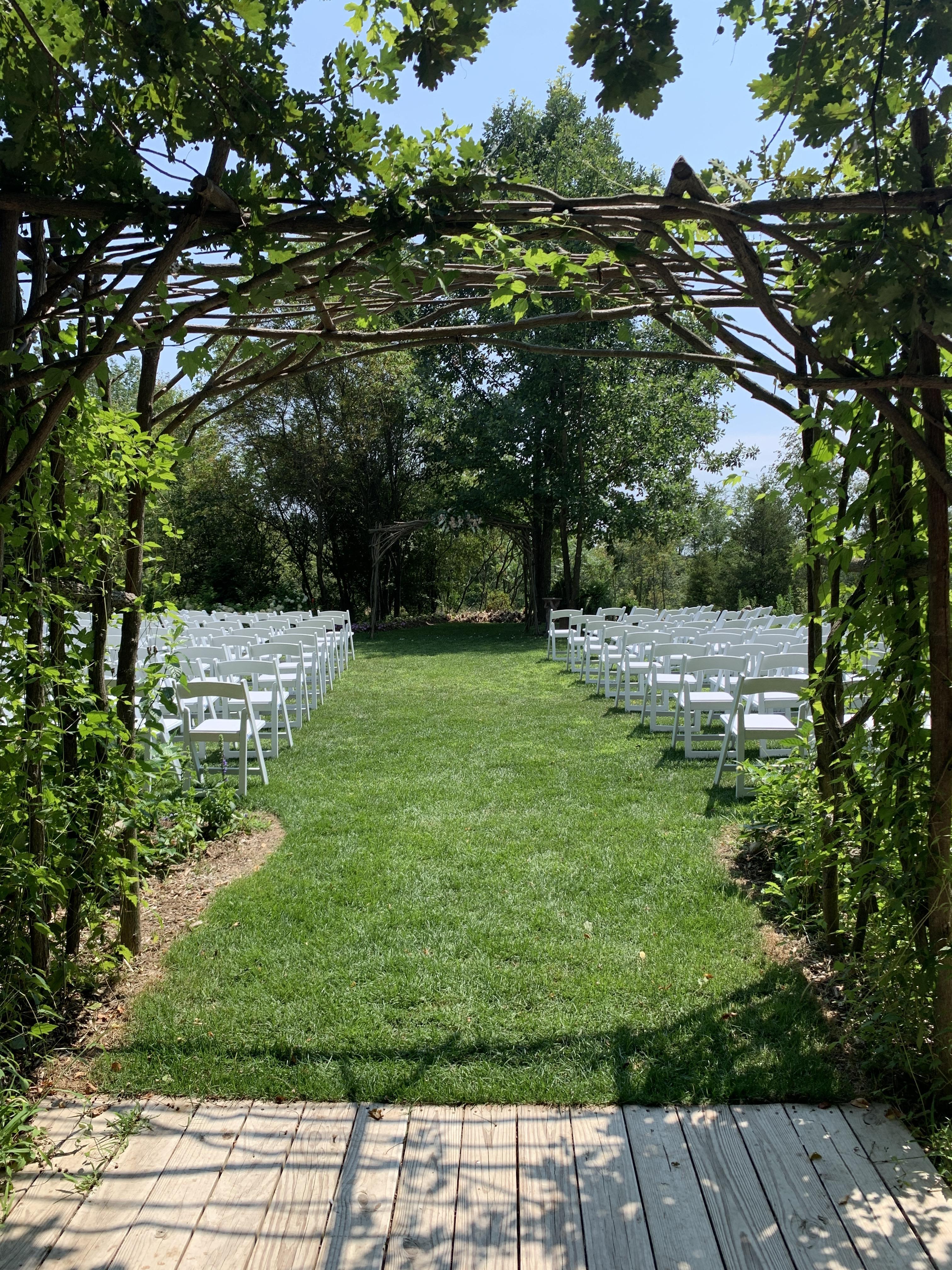 You can't go wrong when choosing between our picturesque outdoor ceremony sites. All of our ceremony sites have power and WiFi. Butterfly Sanctuary Garden with dappled shade, butterflies in flight and willow arbors is hidden in the forest. Calming hillside sets the stage for "Peace" Garden quietly overlooking Inisfree pond. A willow arbor, flagstone terrace create a beautiful stage. Either garden is magical and enchanting for any affair. White Parasols are available for guests if needed.