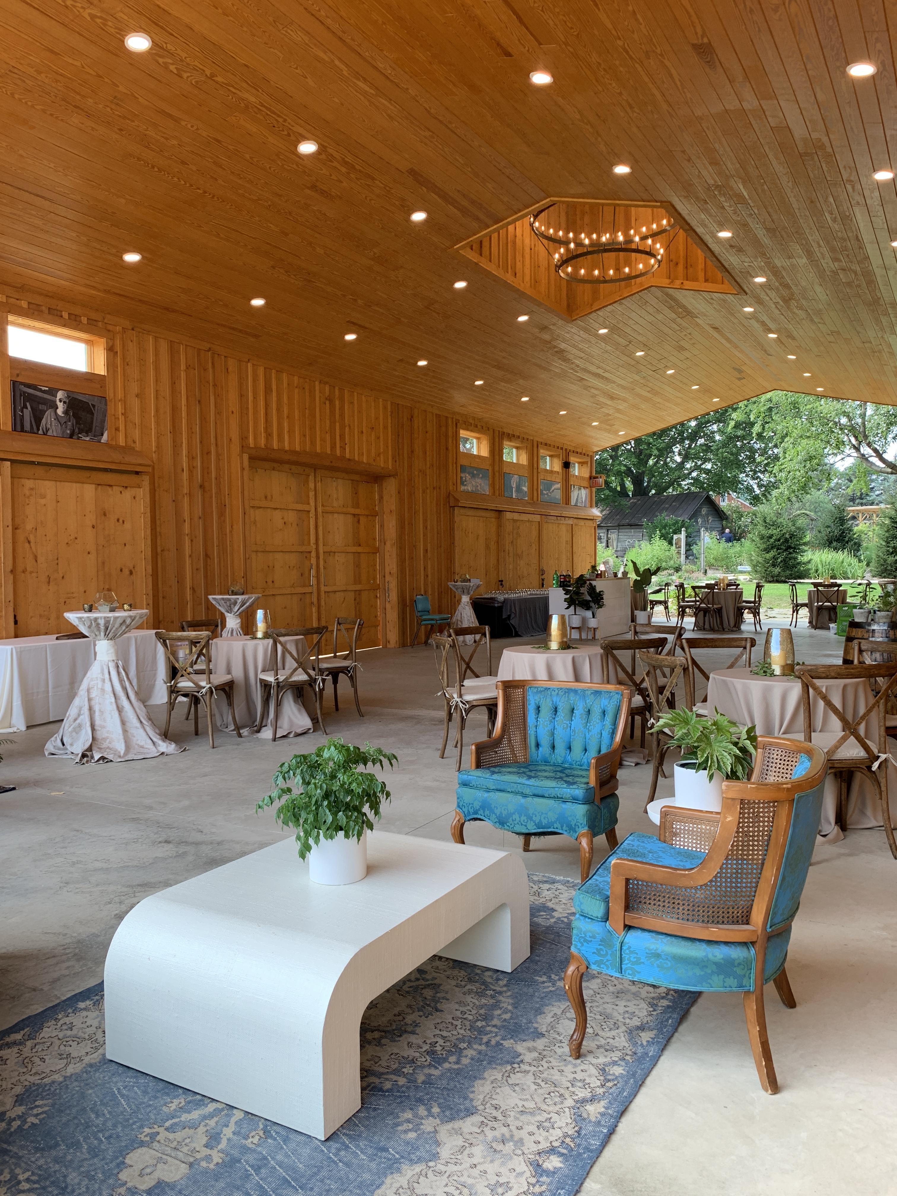 The Pond View Pavilion is magical - large, covered open space to compliment the Historic Barn in design and function. The pavilion an amazing setting for any part of your day - but was specifically built as a shelter in case Mother Nature decided to rain on your outdoor garden wedding. Enhanced with high ceiling and adorned with custom iron chandeliers. Imagine the possibilities!