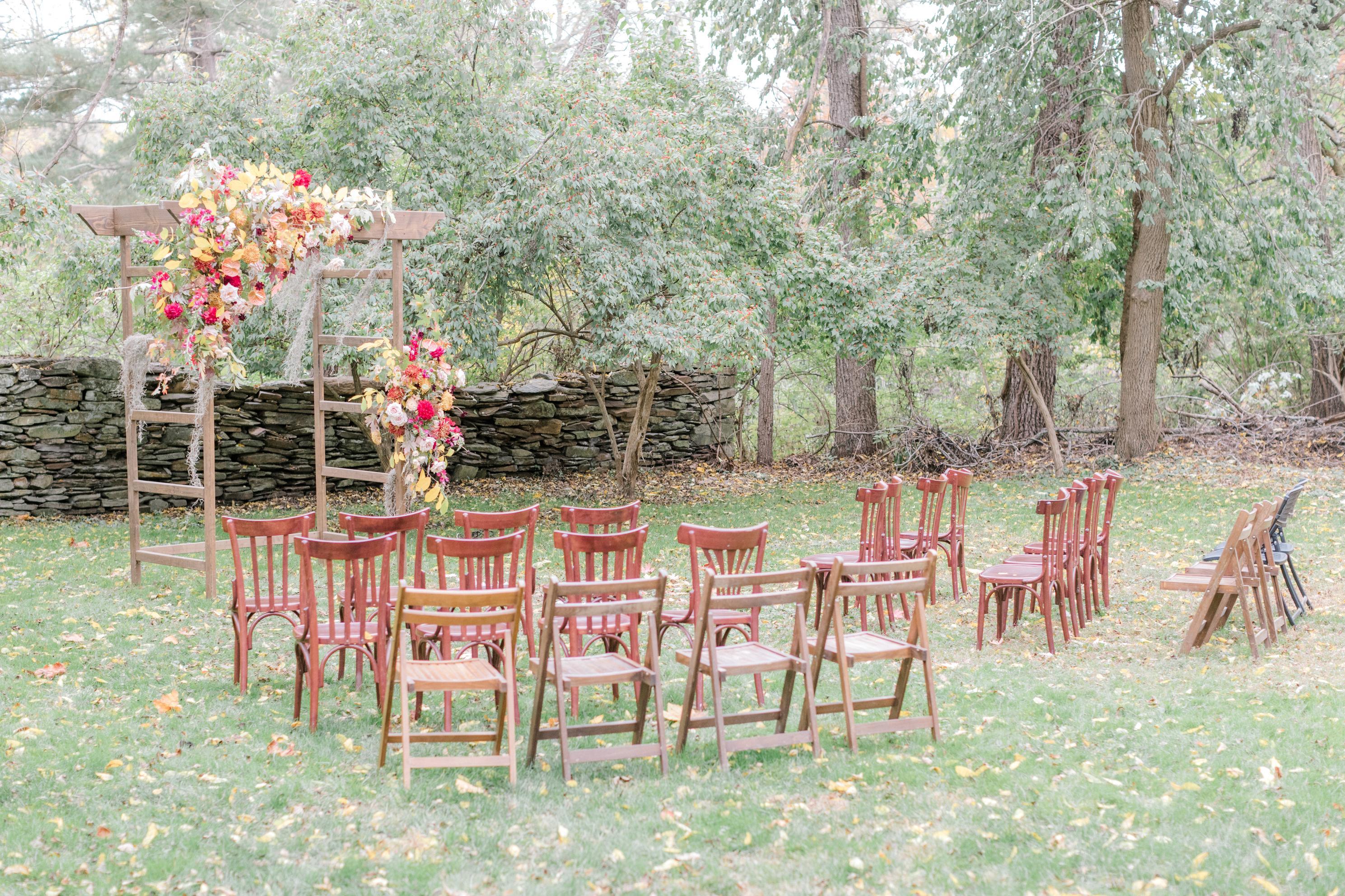 Five 60 inch round tables 25 wooden chairs Wedding arch Rustic decor
