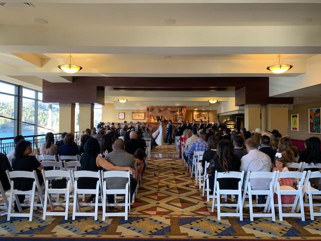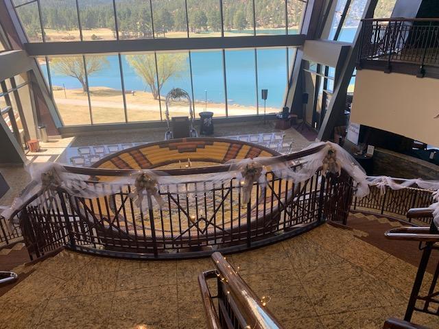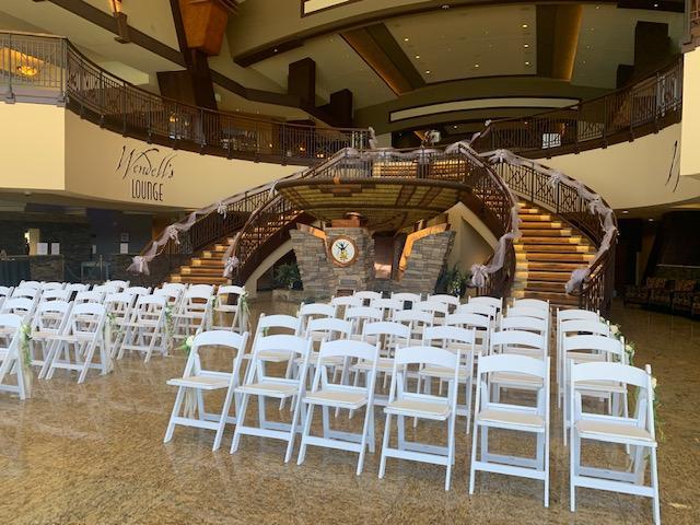 Center Lawn extends from the Hotel to Lake Mescalero. The Concrete Pad, located in front of the outdoor Cascading Waterfall, is ideal for a Ceremony set-up with White Chairs & an Arch. Multiple concrete walkways provide options for the Wedding Party to Enter. The Bride makes her Grand Entrance down the stairs from the Spa. A beautiful location for a Wedding & easy access to the Lake for Romantics after!