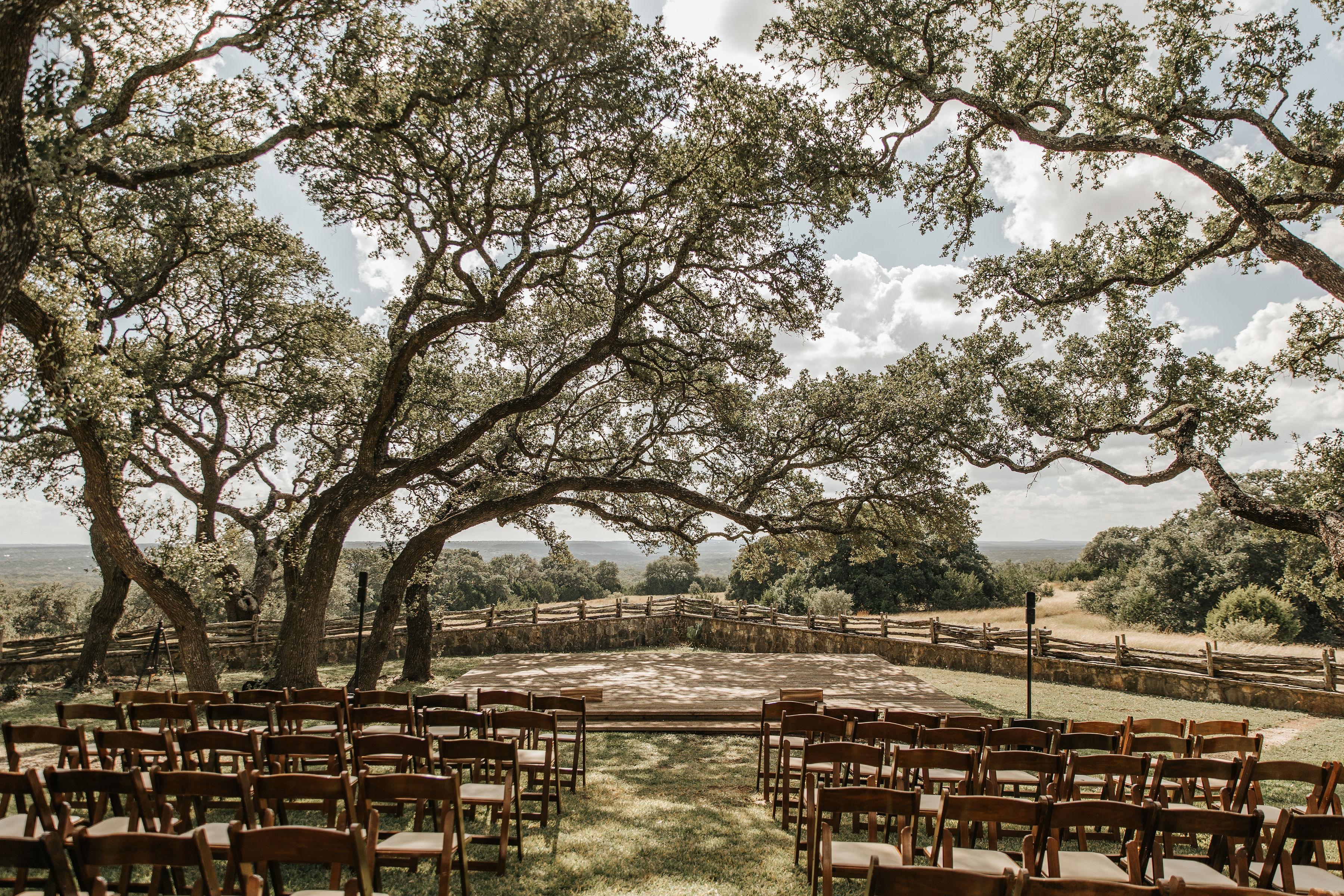 The ceremony site at Inspiring Oaks Ranch offers spectacular Hill Country views and great sunsets, nestled under the canopy of over 100 Live Oak trees.