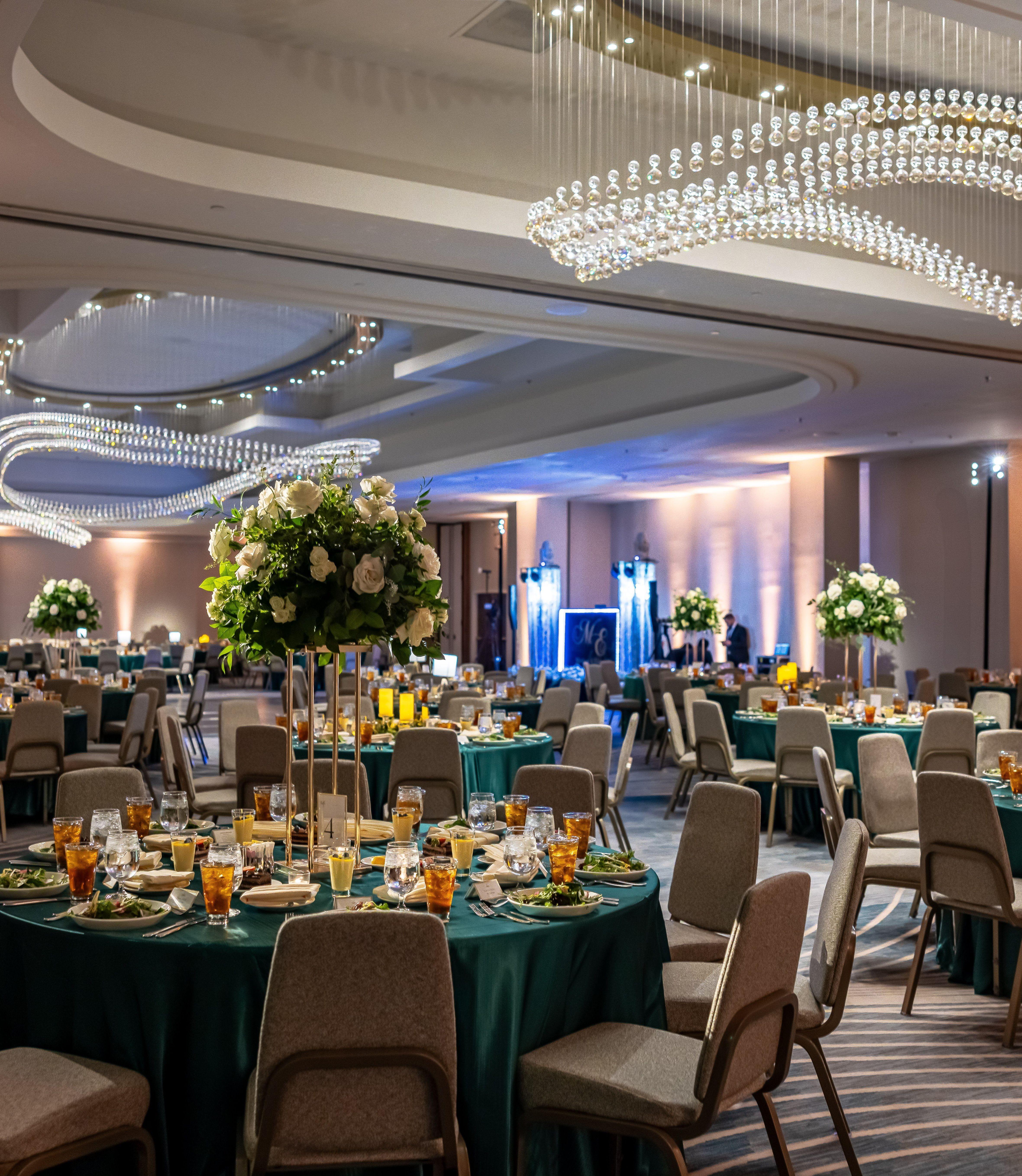 The Pecan Ballroom, an 8,100 sqft venue, accommodates 150-500 guests with amenities like tables, chairs, linens, China, glassware, a stage, dance floor, and on-site AV services. Enjoy full-service catering, starting at $80++ per guest, and custom desserts by an on-site pastry chef. Packages include a courtesy room block, a complimentary king suite stay, and a champagne toast. With flexible pricing and elegant offerings, the Pecan Ballroom is the perfect setting for your dream wedding.