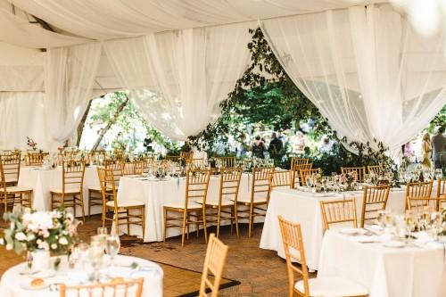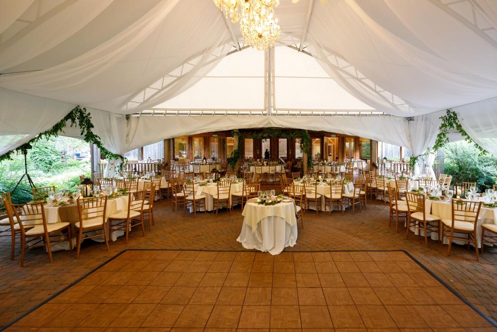 Our largest and most unique space, the Tented Pavilion accommodates up to 220 guests. This permanent tent structure over a beautifully designed brick terrace is surrounded by lush country gardens and in open-air during warmer months.