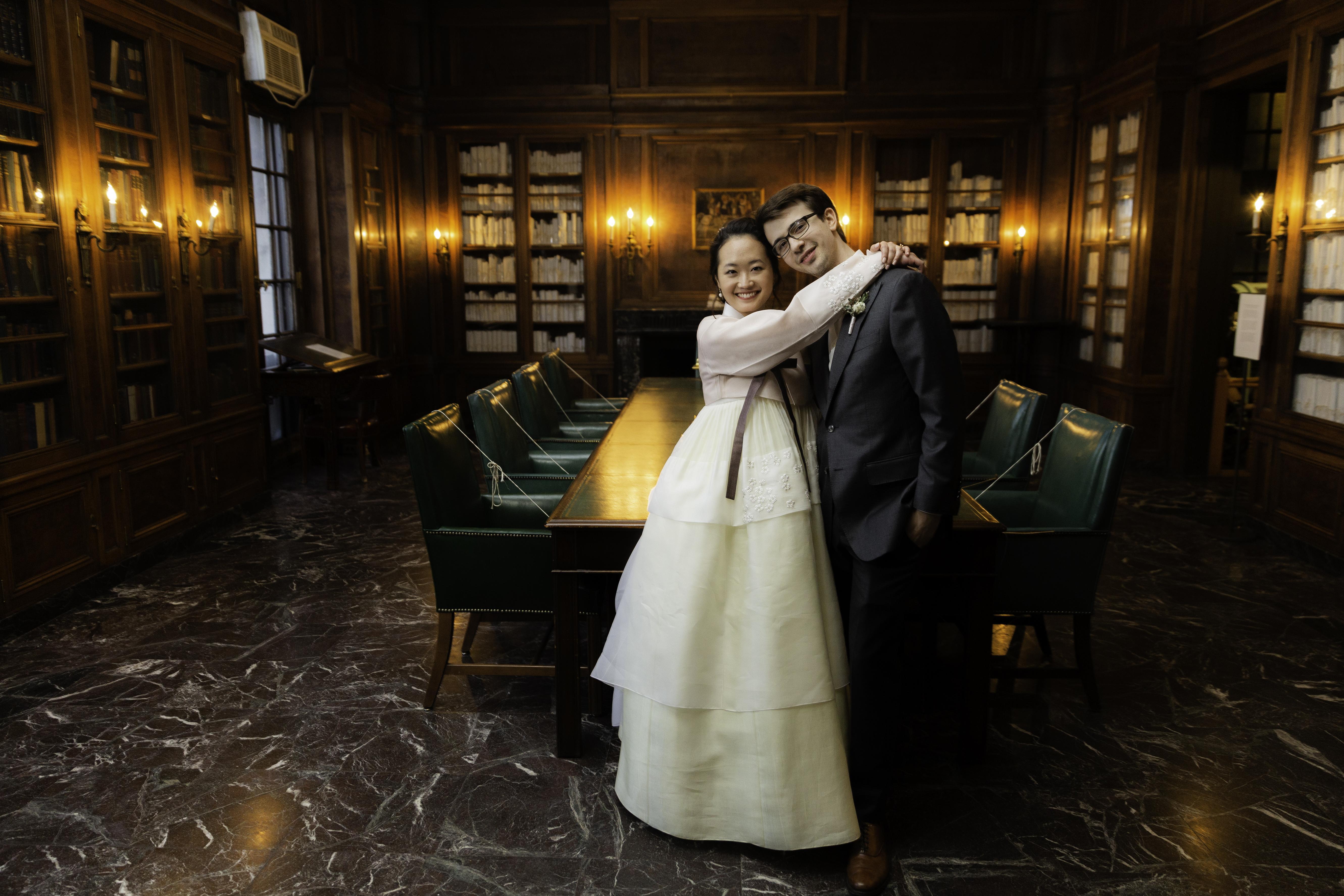 Our historic library is cozy and inviting, with walls paneled in dark wood, glowing wall sconces, and shelves lined with historic manuscripts.