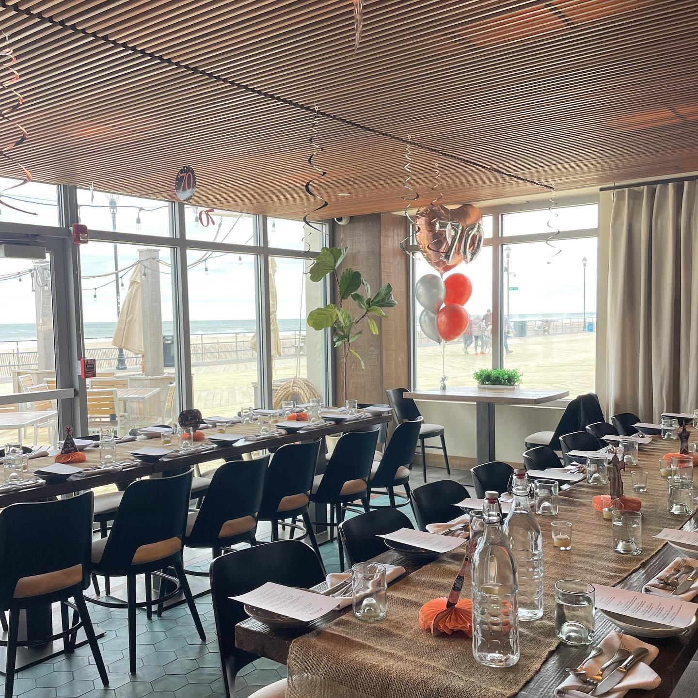 Nestled on the Asbury Park Boardwalk, the Iron Whale offers a stunning blend of rustic seafaring design and modern elegance. With reclaimed wood accents, gas lanterns, and a cozy fireplace, the venue provides a warm and inviting atmosphere. Guests can enjoy panoramic ocean views from the outdoor dining area or the private event space, ideal for weddings, receptions, and special gatherings. The open kitchen adds an interactive touch, while the versatile layout accommodates both intimate and grand celebrations.
