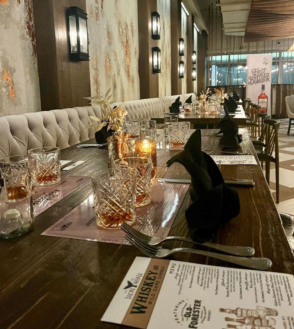"The Iron Whale, located on the Boardwalk in Asbury Park, is quite a departure from the previous ventures of the McLoone Restaurant Group. It features a rustic, yet still contemporary design in the spirit of seafarers, with prominent reclaimed wood, ropes, and gas lanterns. The menu, by executive chef Charles Collins, features inventive takes on seafood including a "Taco Bar," hence the title "Whale". However, it also includes a wide selection of meat presentations, or "Iron"."
