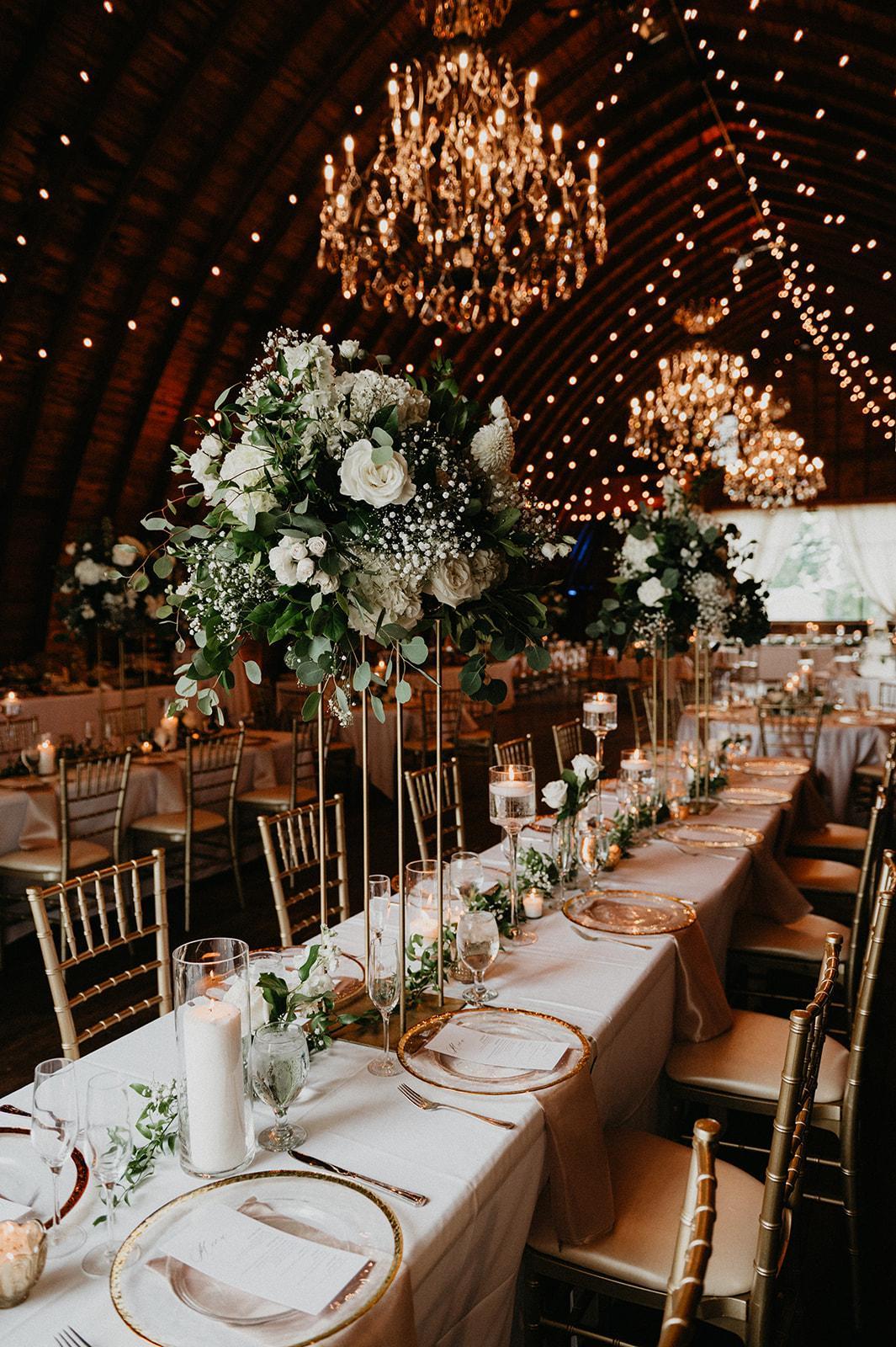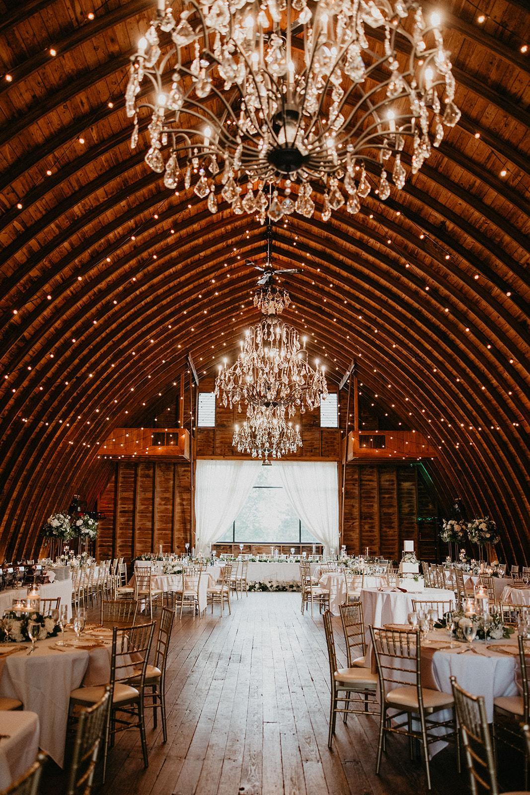 Our upstairs space boasts 3 massive crystal chandeliers offset with twinkle lights, air conditioning + heating and comfortable seating in gold chiavari chairs for up to 200 guests. Guests will be wowed with this gorgeous barn setting!