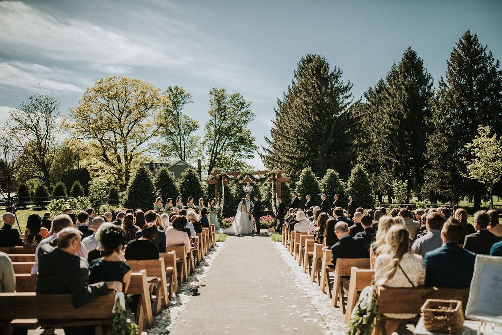 The ceremony location was renovated and landscaped in 2019. Key features include the gorgeous garden landscaping, elegant wood pergola, draping and chandelier decor, Amish-made wood benches for guest seating and solid pad and walkway for the convenience of you and your guests.