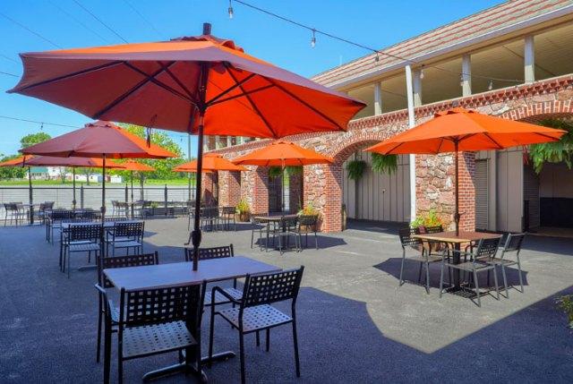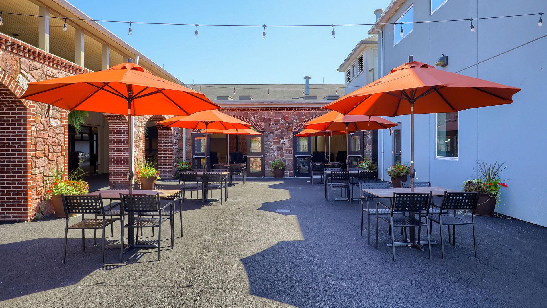 Though spacious, the courtyard offers a cozy feel with potted greenery, warm brick and stone archways, and umbrellas with decorative lighting above. A great space that can be casual or formal depending on the event.