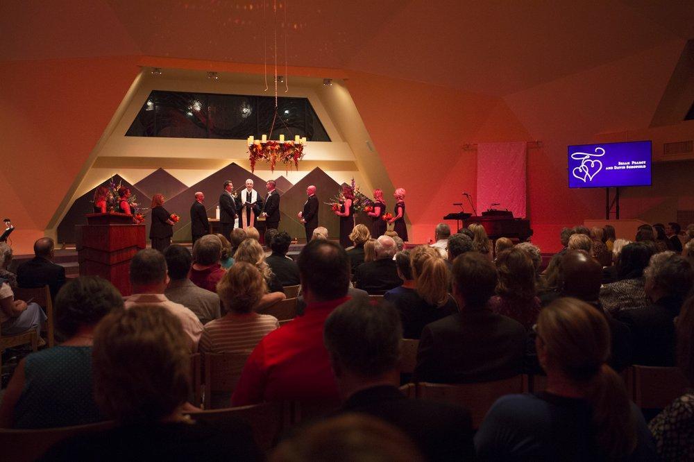 My wife and I got married at IUCC and couldn't be happier about that decision. We wanted to get married in Orange County so our guests would not have to travel a great distance, but all the venues here are so expensive! So when we found this gem in Irvine we jumped on it! We loved the unique space of the geodesic sanctuary and the complementary reception hall. Both were light and bright and we were able to decorate them the way we wanted. The location was also great because we could take pictures on the lake next door while our family and friends were enjoying appetizers and cocktails on the patio before the reception started. We were pleasantly surprised that the officiant was included, but as a same gender couple were worried about getting married by a pastor. When we found out that Pastor Sarah and the IUCC church had a long history of fighting for equal marriage we were impressed and even happier about our selection. And it was great how she took the time to meet with us and really hear our story so that it felt like the whole ceremony was so personal. Our wedding was perfect! Thank you!