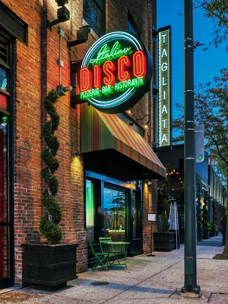 Take a trip back to the days of groove and glam at Italian Disco, a vibrant Italian joint located in downtown Baltimore's historic Bagby building in Harbor East. We flip the classic Italian restaurant on its head, infusing it with old-school flavor and modern energy. Our menu, crafted by famed Italian chef Julian Marucci, features delicious Italian cooking alongside an extensive beer list and full bar. Italian Disco is the perfect spot for a lively rehearsal dinner or a celebratory late-night gathering with great food, drinks, and tunes straight out of the 70s and 80s.