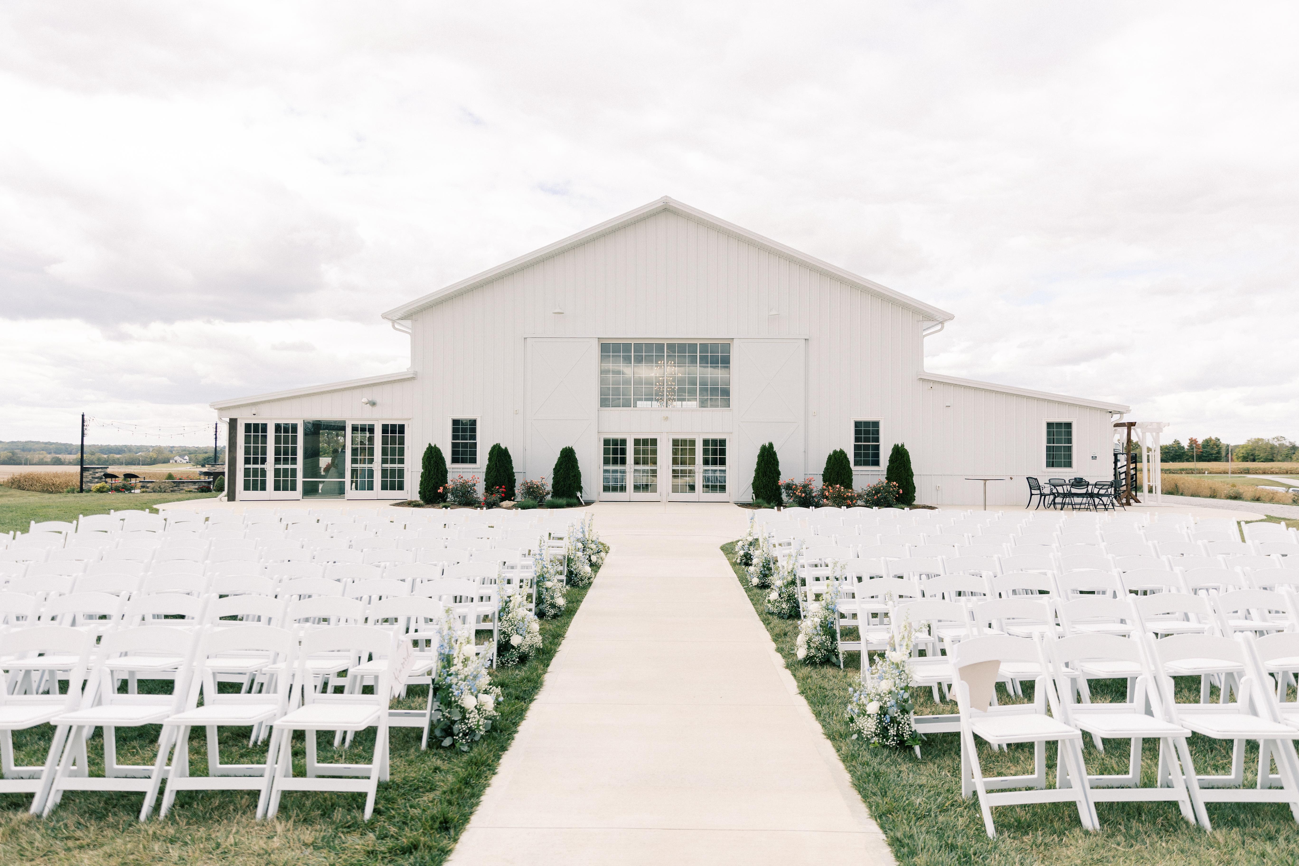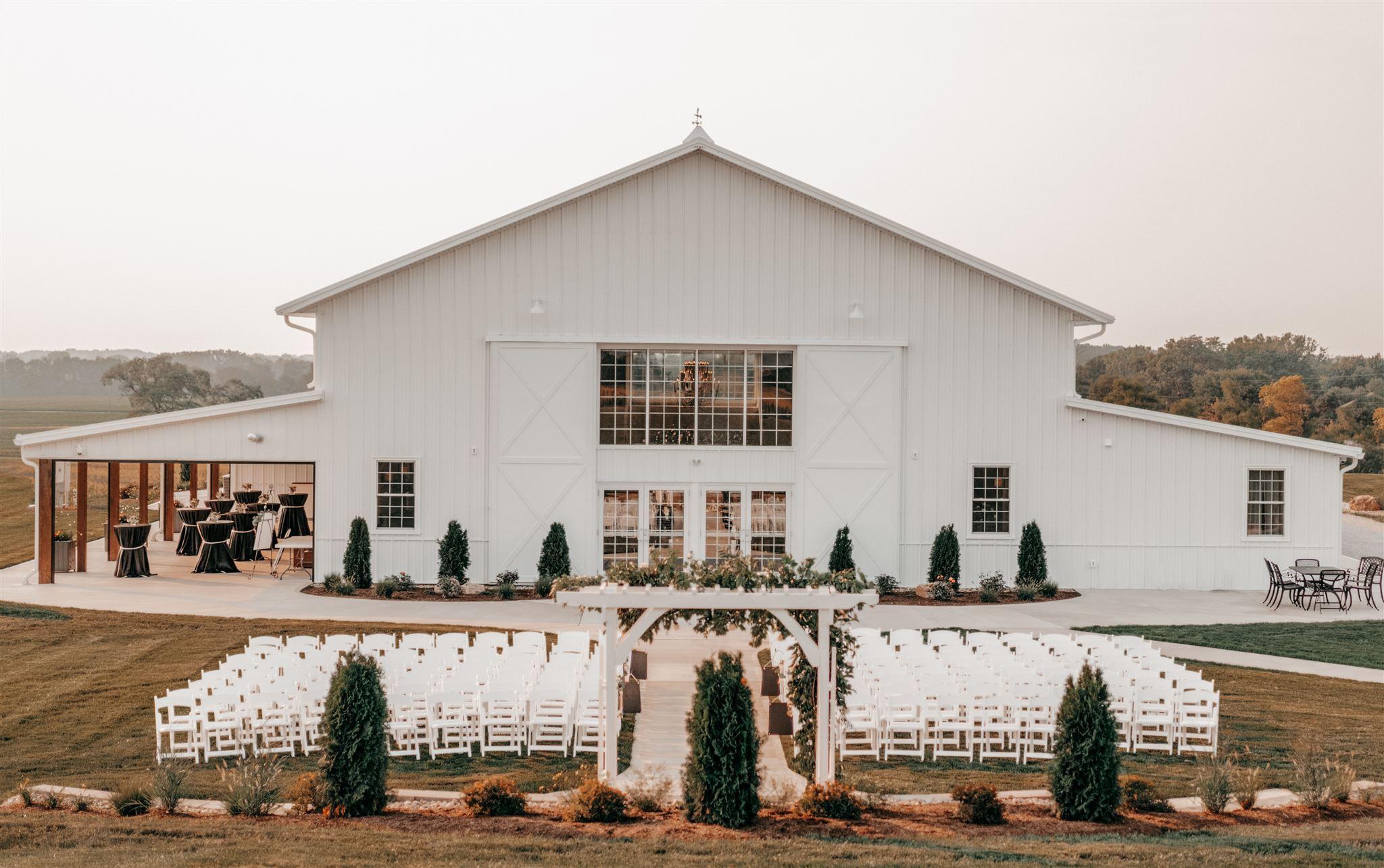 We are newly built venue that opened in July of 2021. If you are looking for a "chic & classy" venue with quiet, picturesque views and beautiful sunsets, Ivory Meadows is your place! With natural rolling meadows, you will be in awe from the moment you pull into the winding driveway viewing the white barn on top of the hill. The lush green grass surrounds the venue with also a 2 acre wild flower field. When couples walk inside, they love the almost 30 foot high ceiling and the 5 aged iron elegant chandeliers. Our couples love the " white distressed shiplap" on the 3 walls and the ceiling, creating a beautiful backdrop for pictures. This blank canvas allows couples to create the look that they desire! Do as little or as much as you'd like. It's flexible enough to make it formal or even rustic if you like! The photo opportunities are endless with the different views on the rolling meadows. Our heated and screened in patio allows us to use this space all year for cocktail hour!