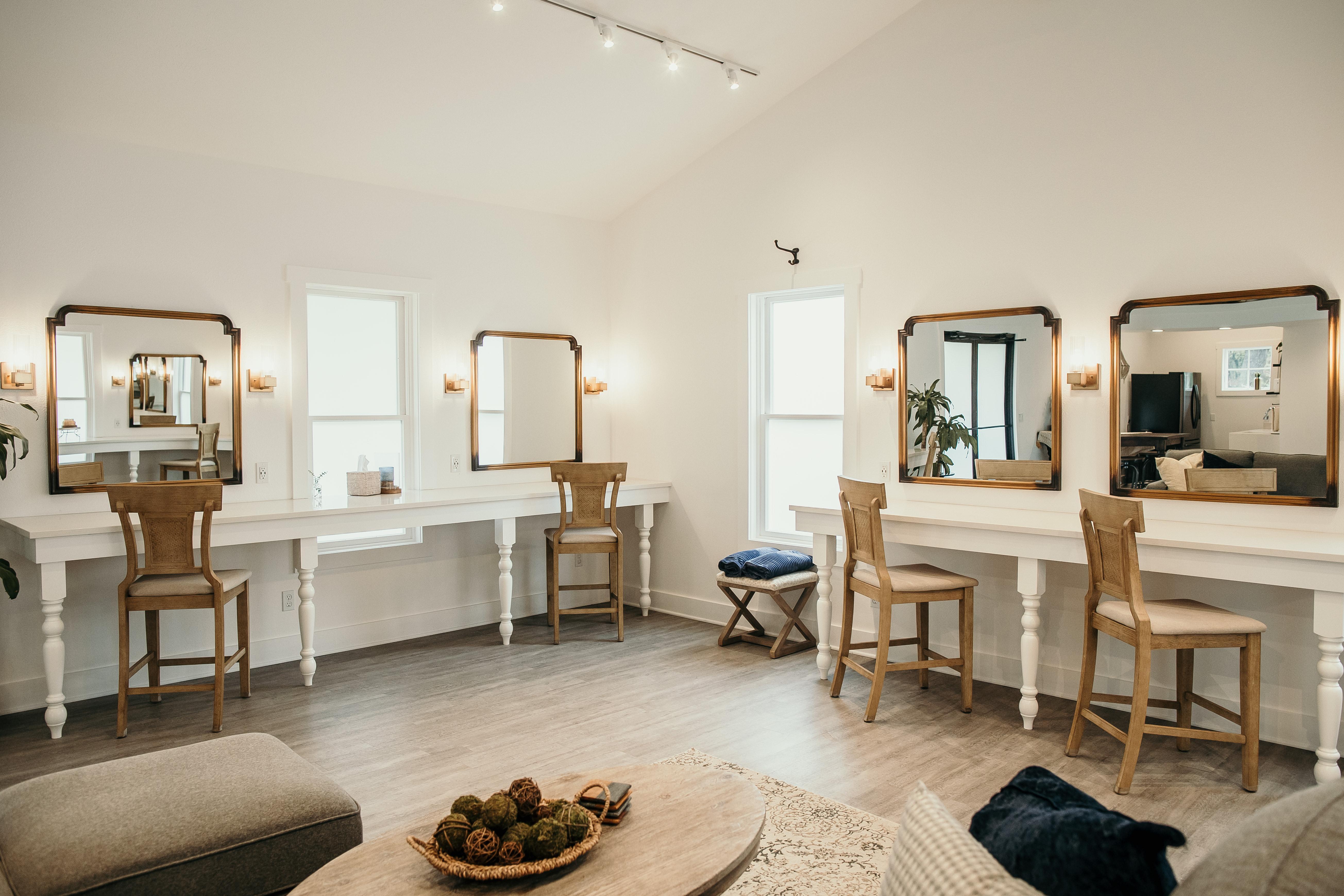 - 6 getting ready stations - Couch Area - Custom Mirror with custom outfit rack - Kitchenette with full fridge and Keruig - Indoor eating area - Outdoor eating area - Outdoor sitting area - Soft Outdoor Sitting Area - Private Back Patio - Front Patio - Sonos