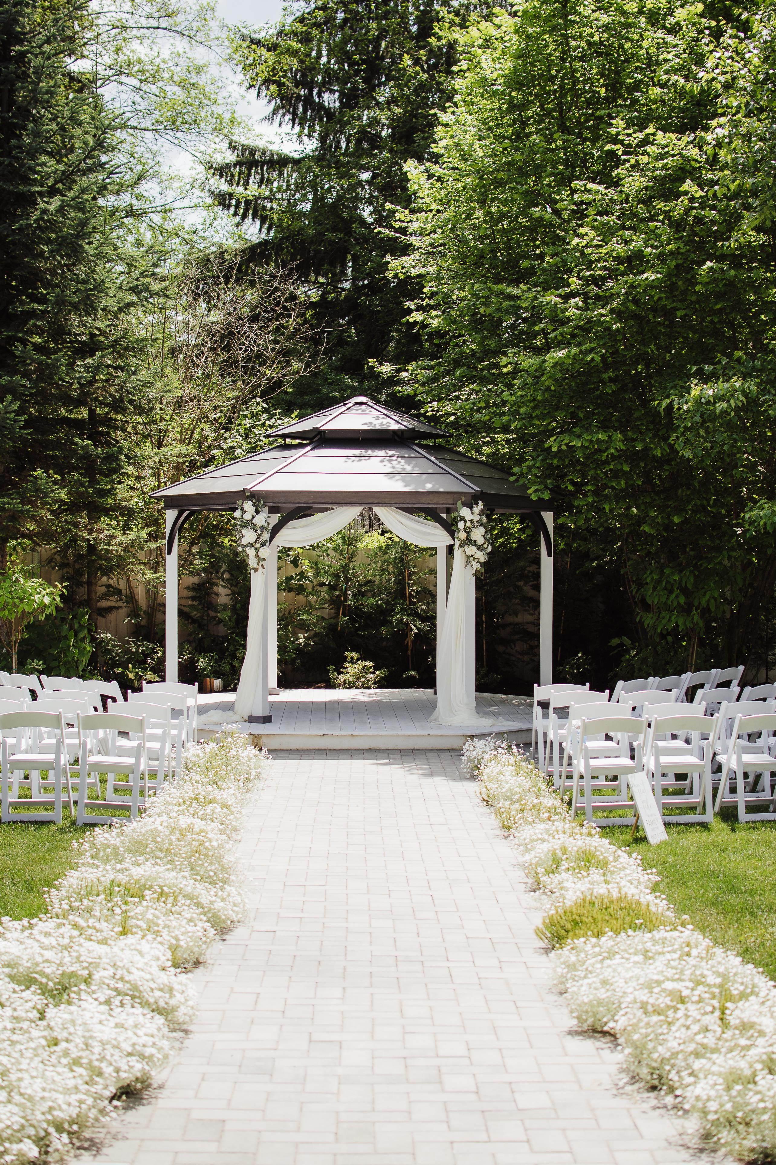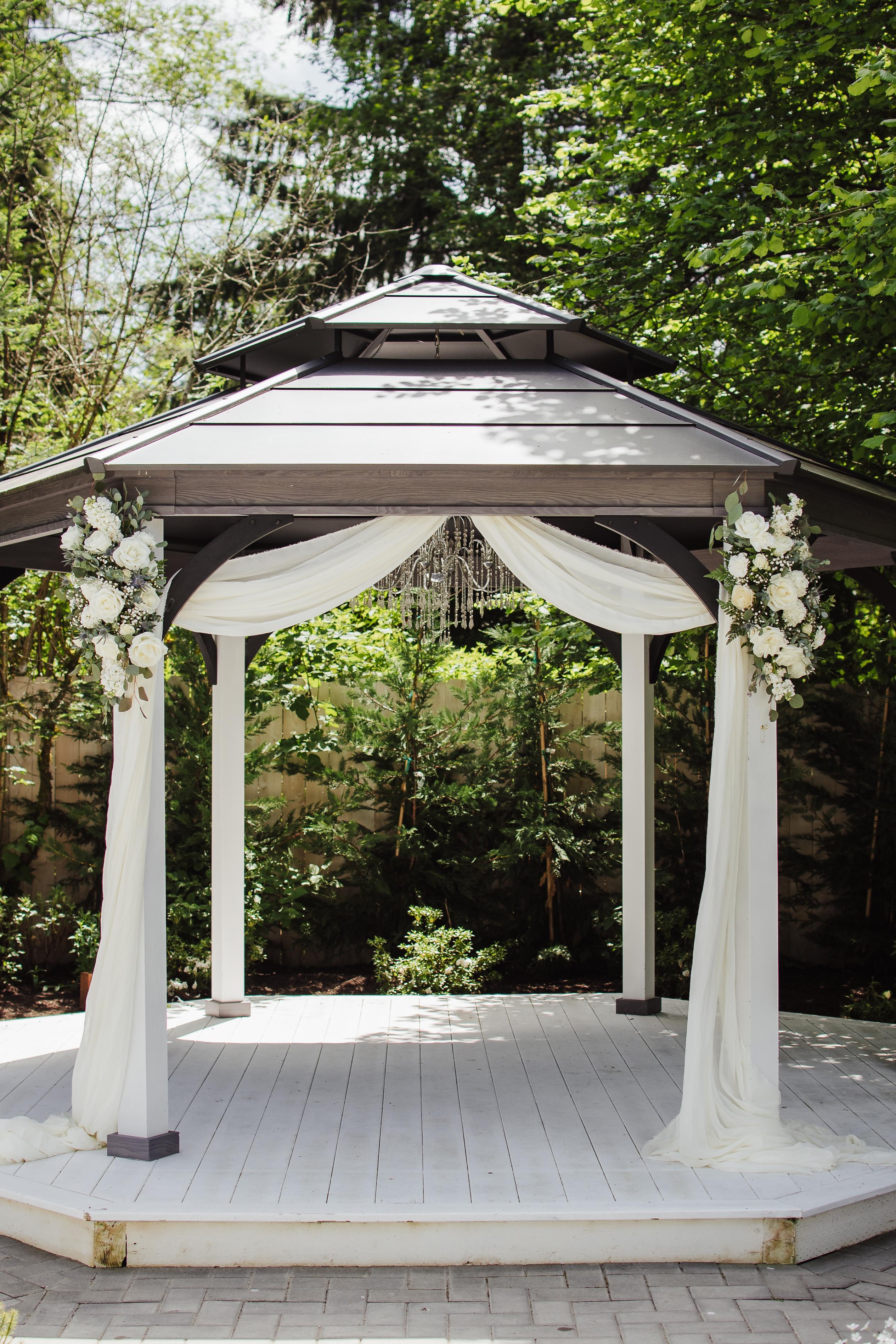 Beautiful custom gazebo with lush greenery background with crystal chandelier hanging from center.