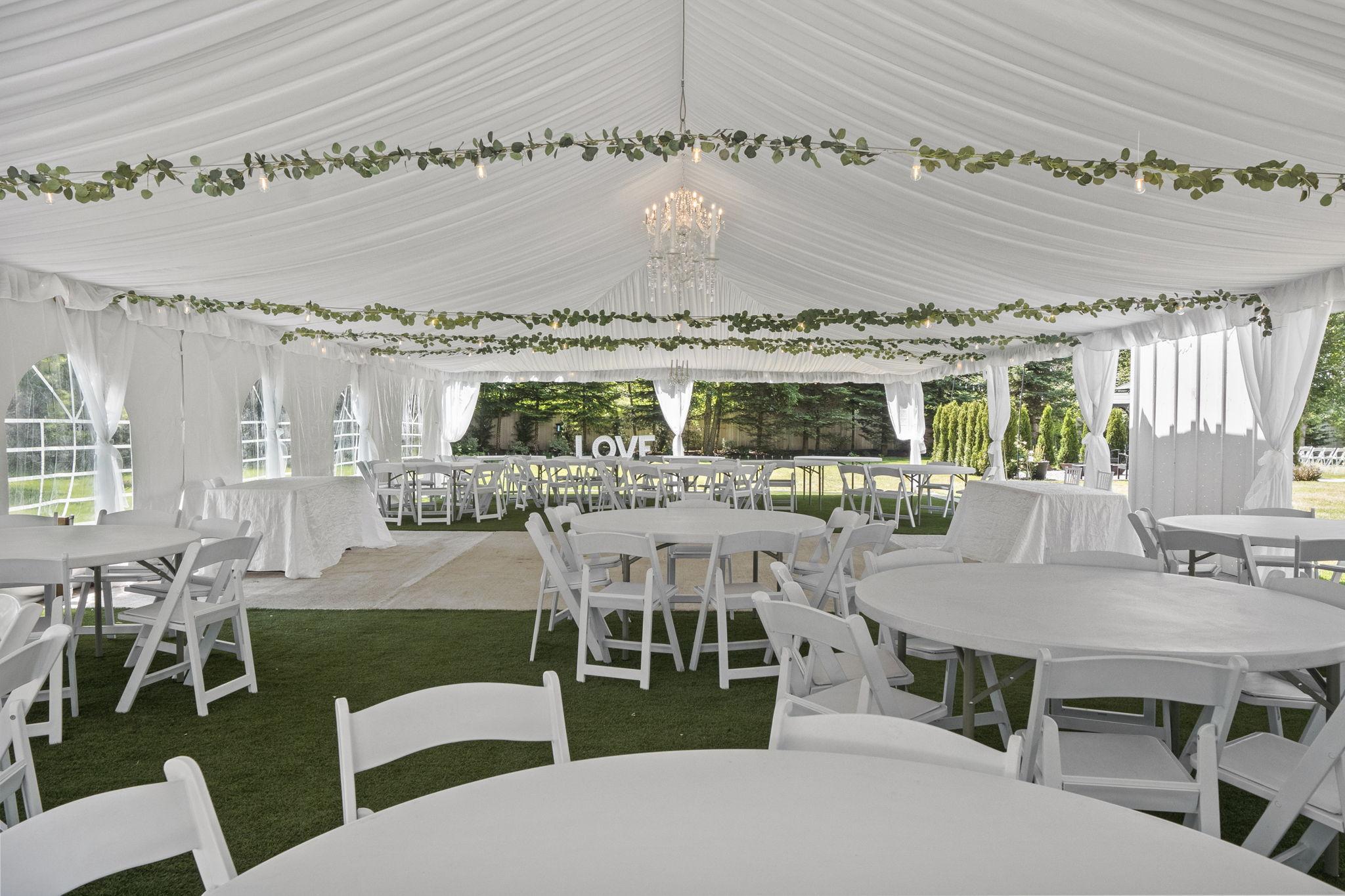 60 x 30 tent perfect covered space for reception. Can hold 20 round 60 inch tables and chairs. Tent has draping and bistro light all the way around the sides and across the tent as well. Each tent leg is also draped with sheer panels. With 3 chandeliers hanging above.