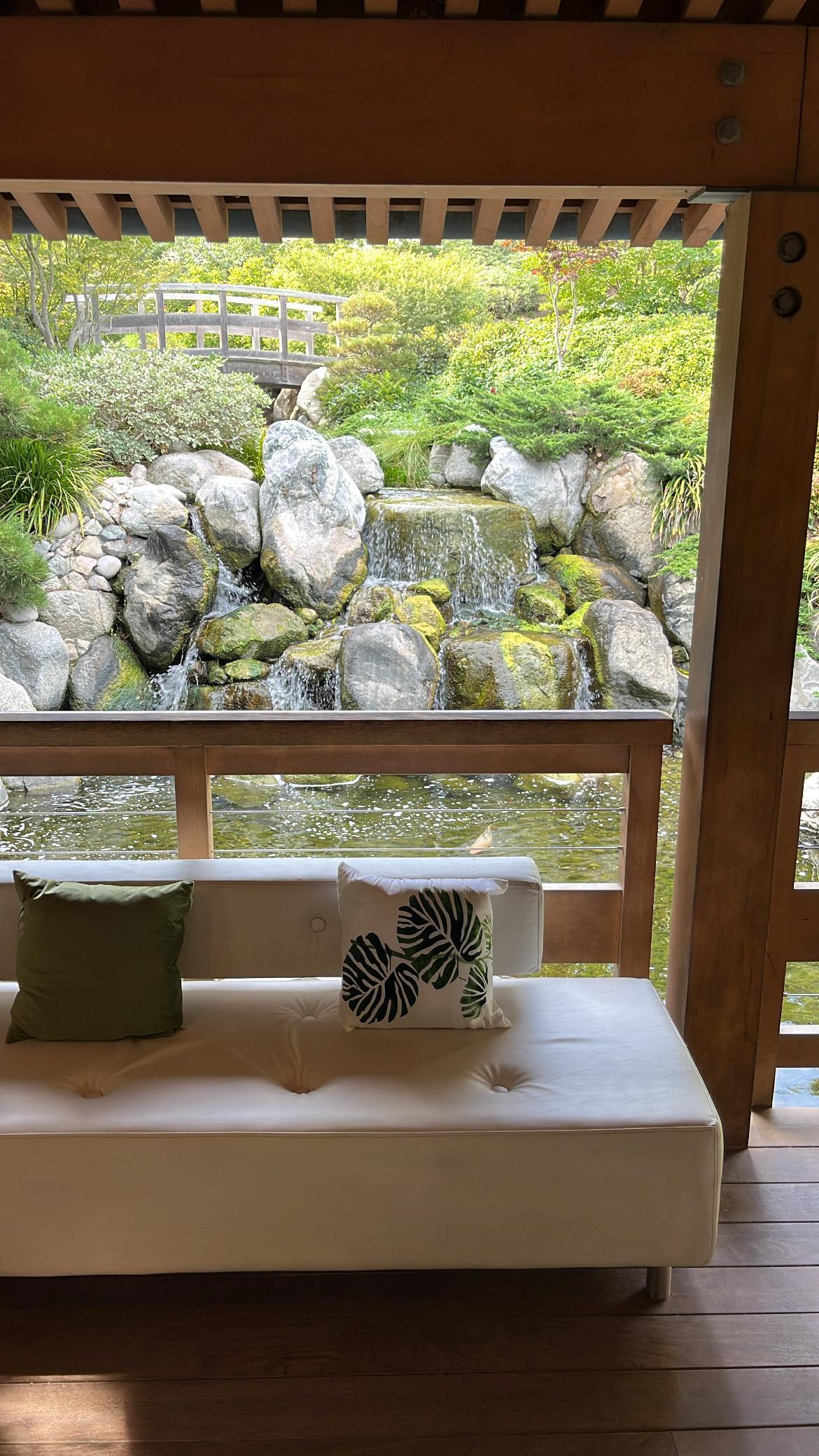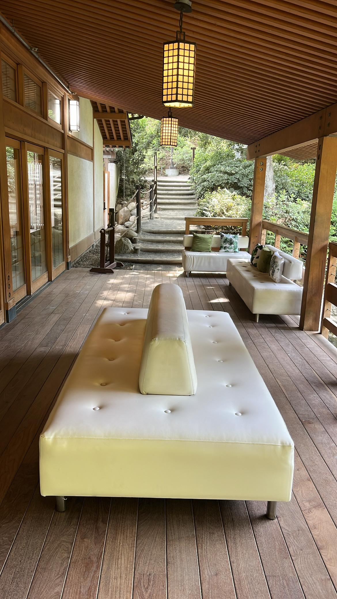 Beautiful authentic Japanese architecture; the room is open-air and has a flow with the Lower Garden Koi Deck and a view of a waterfall and koi pond.