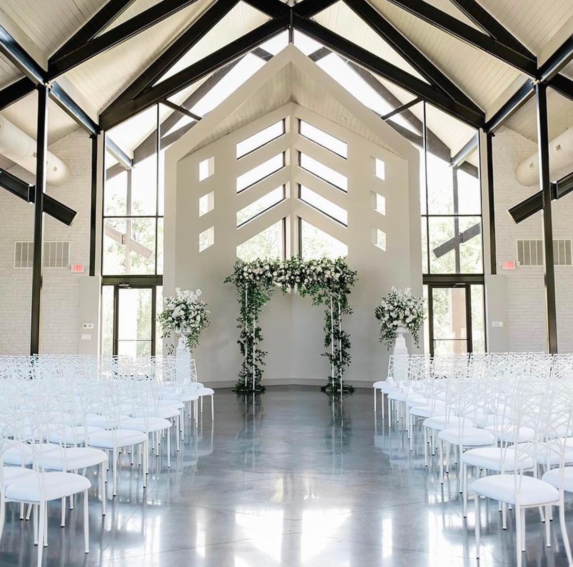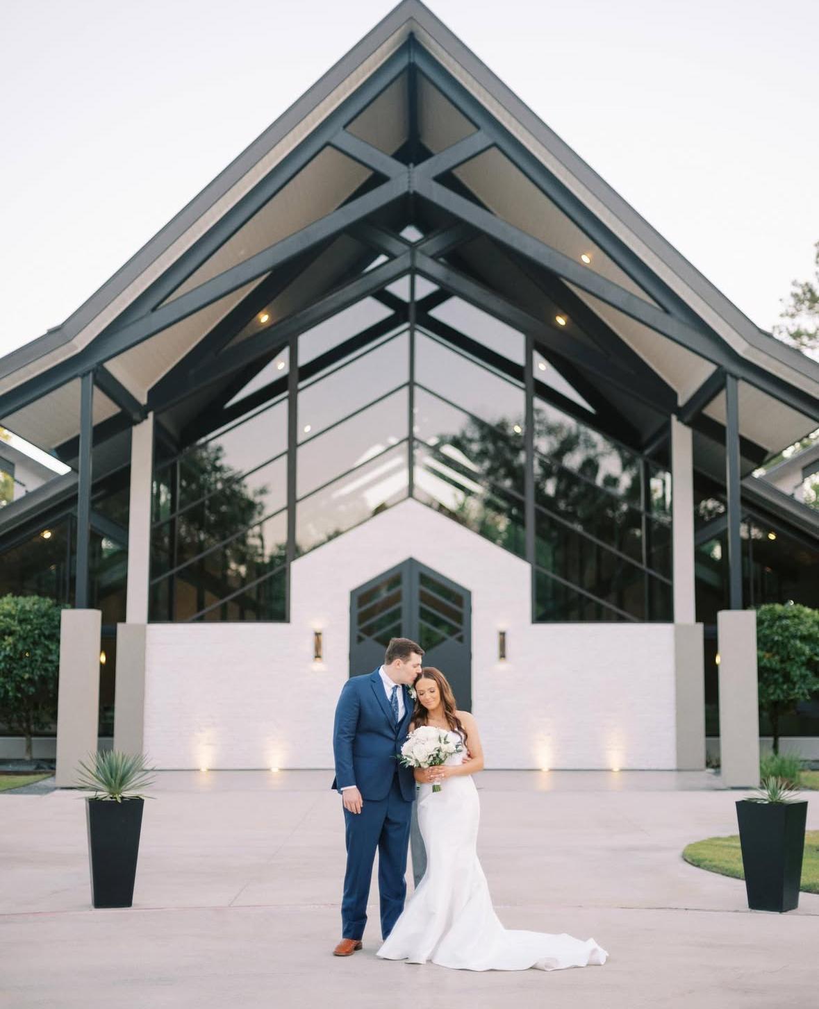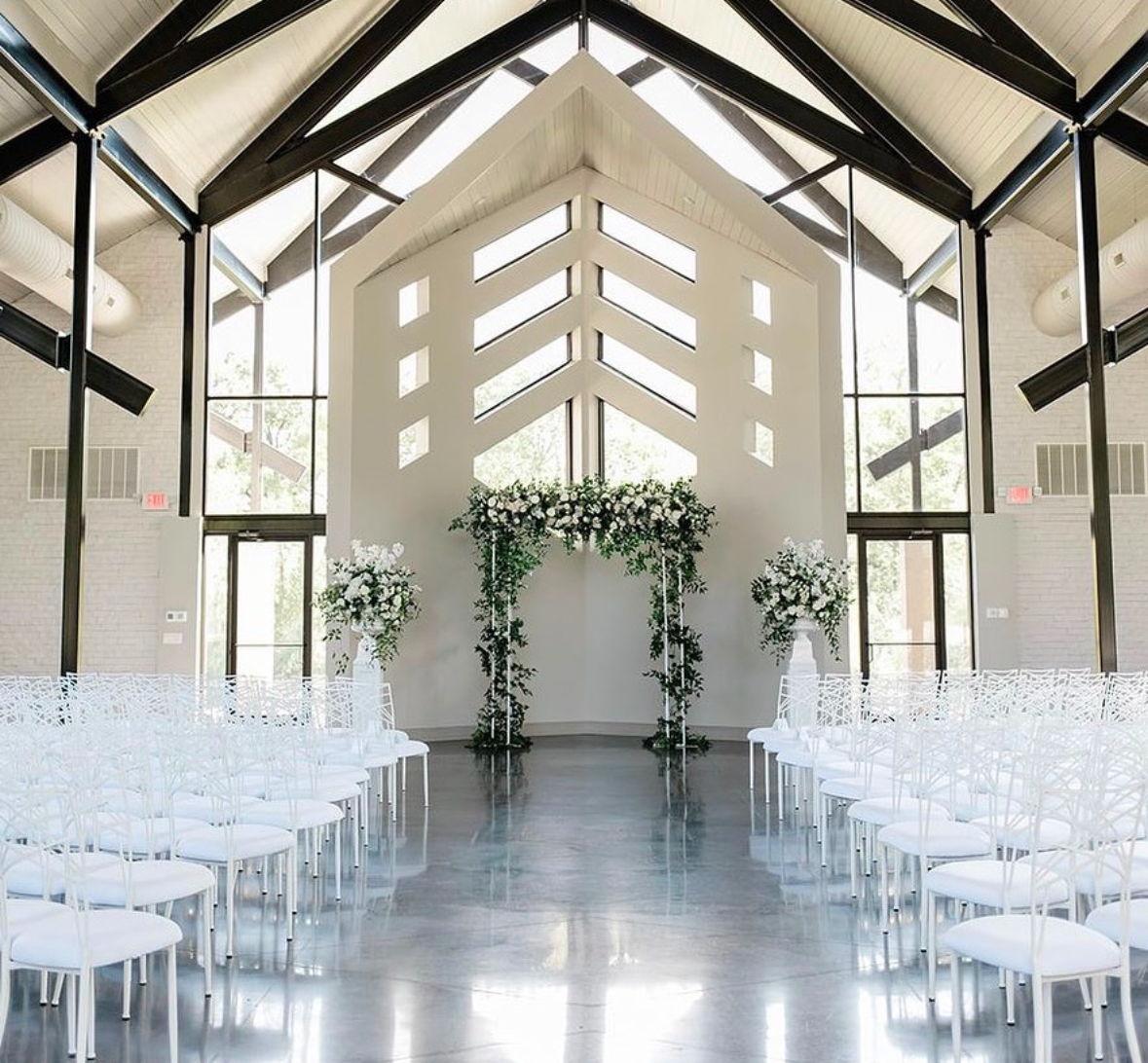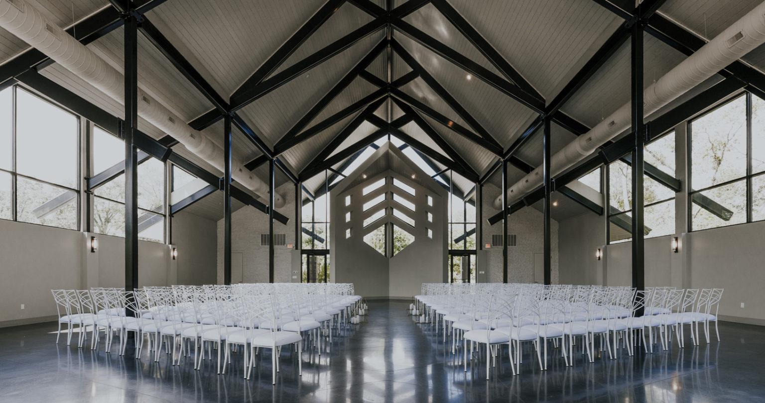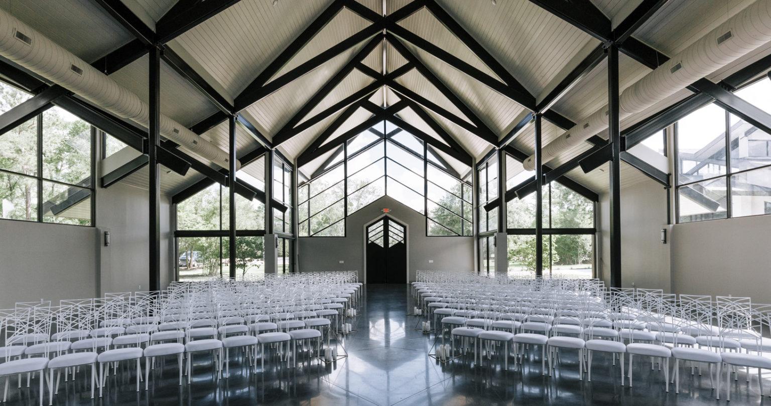 Sprawling across 9 acres, Jennings Trace’s modern-industrial venue sits in perfect harmony with a picturesque landscape full of towering pines and majestic oaks. Bright and contemporary spaces — including a sun-drenched chapel and a grand reception hall — set an impossibly romantic scene for a nature-inspired wedding, while ample outdoor areas allow for unforgettable gatherings under the vast, open sky.