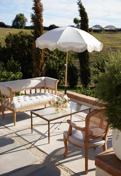• Access to the property from 8am to 10pm • Exclusive use of the entire estate, including reception and ceremony spaces • Complimentary Bridal Suite with a bottle of champagne • Complimentary Men’s Suite with a bottle of champagne • Access to the Lounge/Library area • Fully stocked built-in bar with all necessary backbar supplies (Clients supply their own alcohol; no minimum required) • French-styled furniture and accent pieces (Includes 5 couches and 12 upholstered chairs) • 20 high-top cocktail tables • 12 rectangular tables (96in x 40in) • 14 round tables (60in) • 24ft x 24ft white oak dance floor • 6 fringe umbrellas with bases • 3 extra-large umbrellas with bases • Pergola with drapes (basic draping labor included) • 20 decorative chandeliers • Cross back farm chairs • Candle holders and hurricane glass • Parking facilities • Wood folding ceremony chairs • 2 speakers for ceremony and microphone