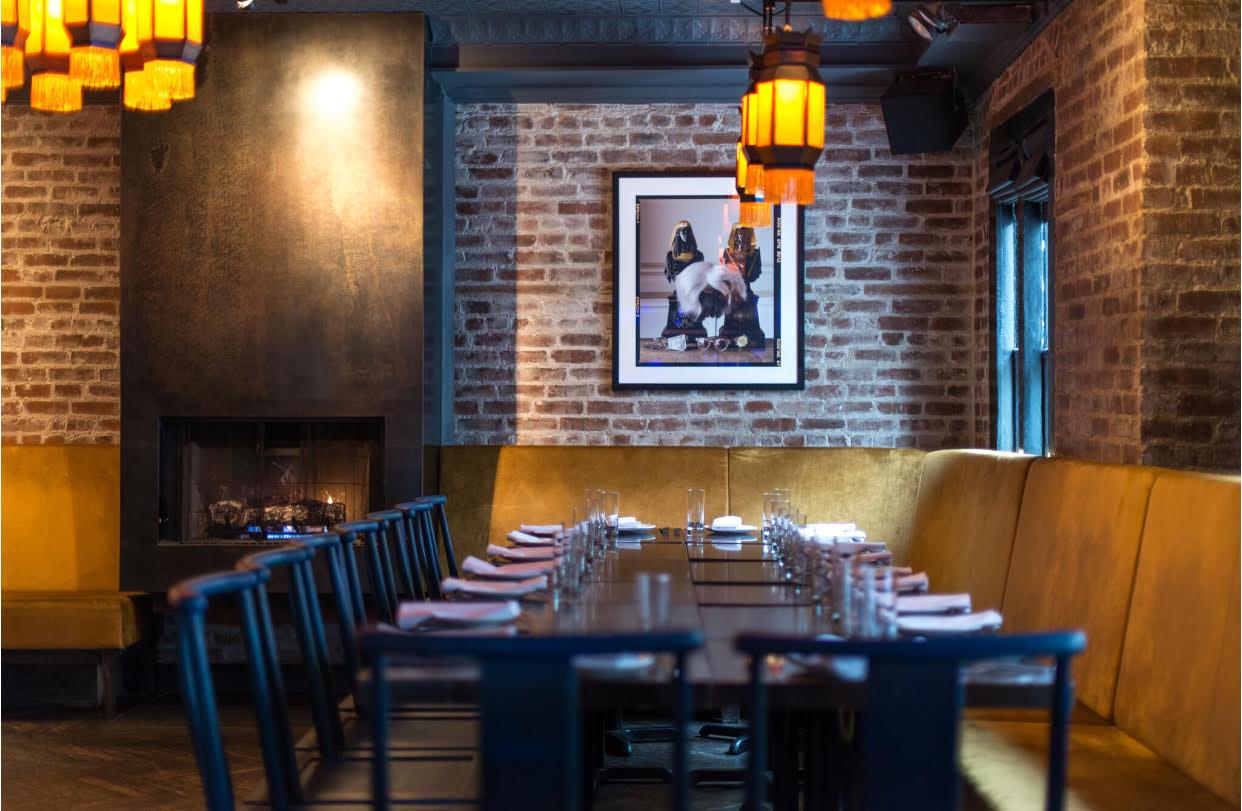 This welcoming room features brick walls, a gorgeous hand crafted chandelier and dynamic art work along with a large bar for guests to sip on a cocktail before or after their dinner party. Perfect for groups looking to enjoy a scene and people watch.