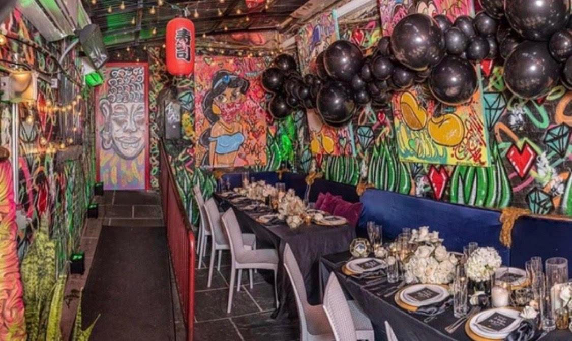 The Alley is covered in a striking and constantly changing mural painted by the world's most notorious graffiti artists. It's super private and very fun. It's also equipped with a flat-screen TV for sporting events or music videos.
