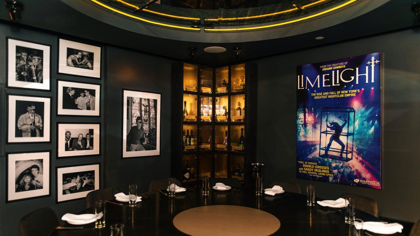 This is our most VIP and intimate dining room, It's decorated with one of a kind collectors’ items from Limelight’s colorful past including signed photographs and custom pieces from the Club's heyday. This unique setting offers guests an exclusive dining experience. Perfect for meetings, birthday parties, screenings and celebrations, guests can make use of the state of the art sound system, flat-screen TV and private lockers to store your favorite bottles or whatever.