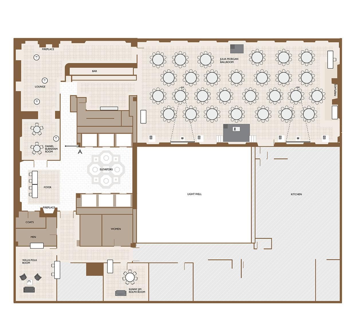 Events at the Julia Morgan Ballroom enjoy the use of the entire 15,500 square foot 15th floor of the landmark Merchants Exchange, which includes the Ballroom and a range of associated breakout rooms, pre-event spaces and one of the City’s finest commercial kitchens. The Ballroom itself offers more than 4,300 square feet of unobstructed exhibit and event space, five accompanying breakout rooms, and a bar and lounge.