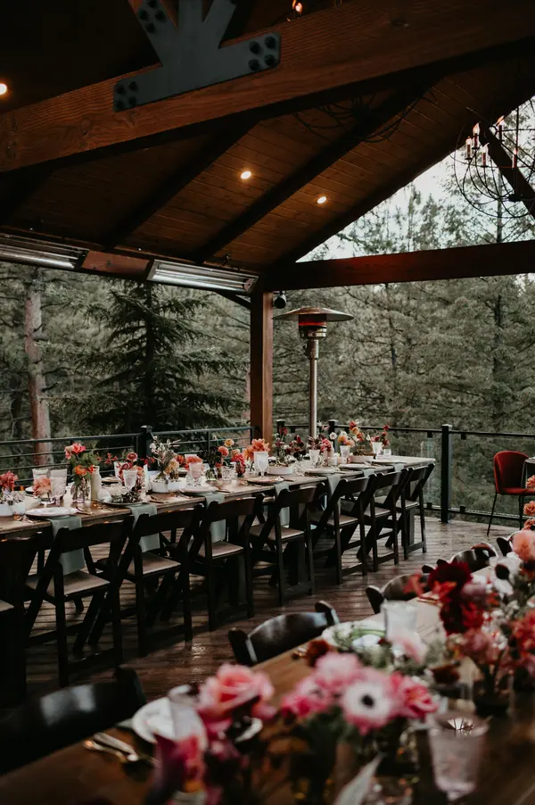 The deck seats up to 50 guests and offers stunning mountain views. String lighting overhead, 8' farm tables and fruitwood chairs give a rustic vibe.
