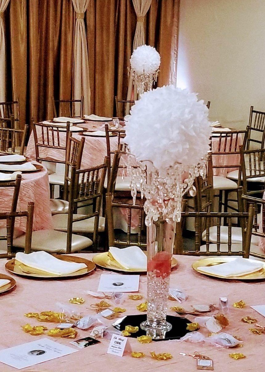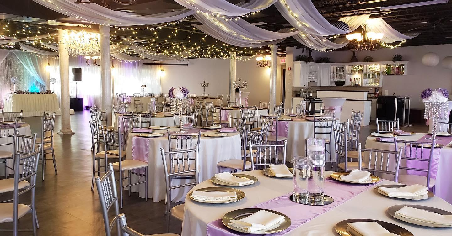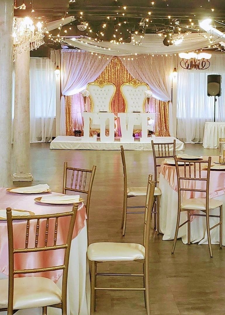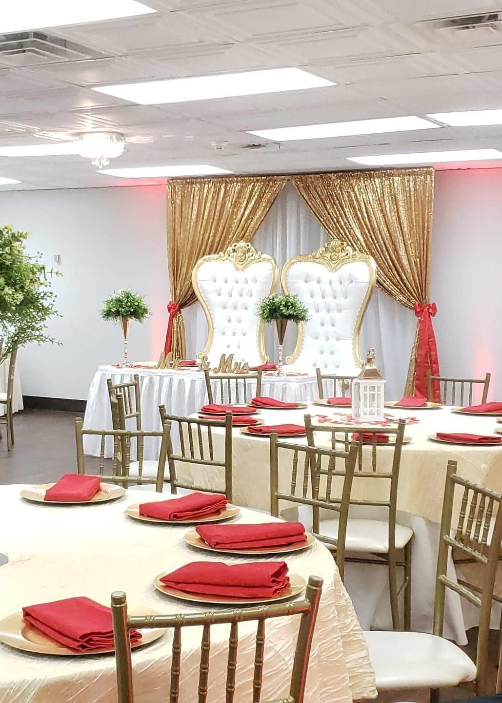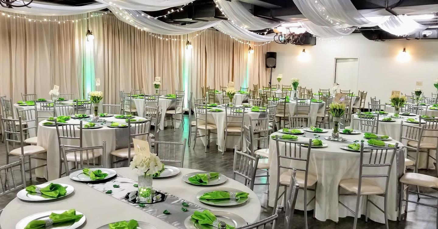 Welcome. Jupiter Gardens Event Center is a gorgeous event space offering three ballrooms and an outdoor garden. Are you looking for an affordable upscale wedding reception venue? Let me recommend the Athena ballroom. This is a Grand Ballroom capable of sitting 280 guests. It is a modern, luxurious space for a romantic, elegant, wedding reception and fun party. The swanky ballroom comes with sumptuous fabric wall hangings, a granite mirrored bar, and an expansive dance floor that will keep guests dancing all night long! This room also comes with great ambiance lighting or natural light by drawing the blinds.